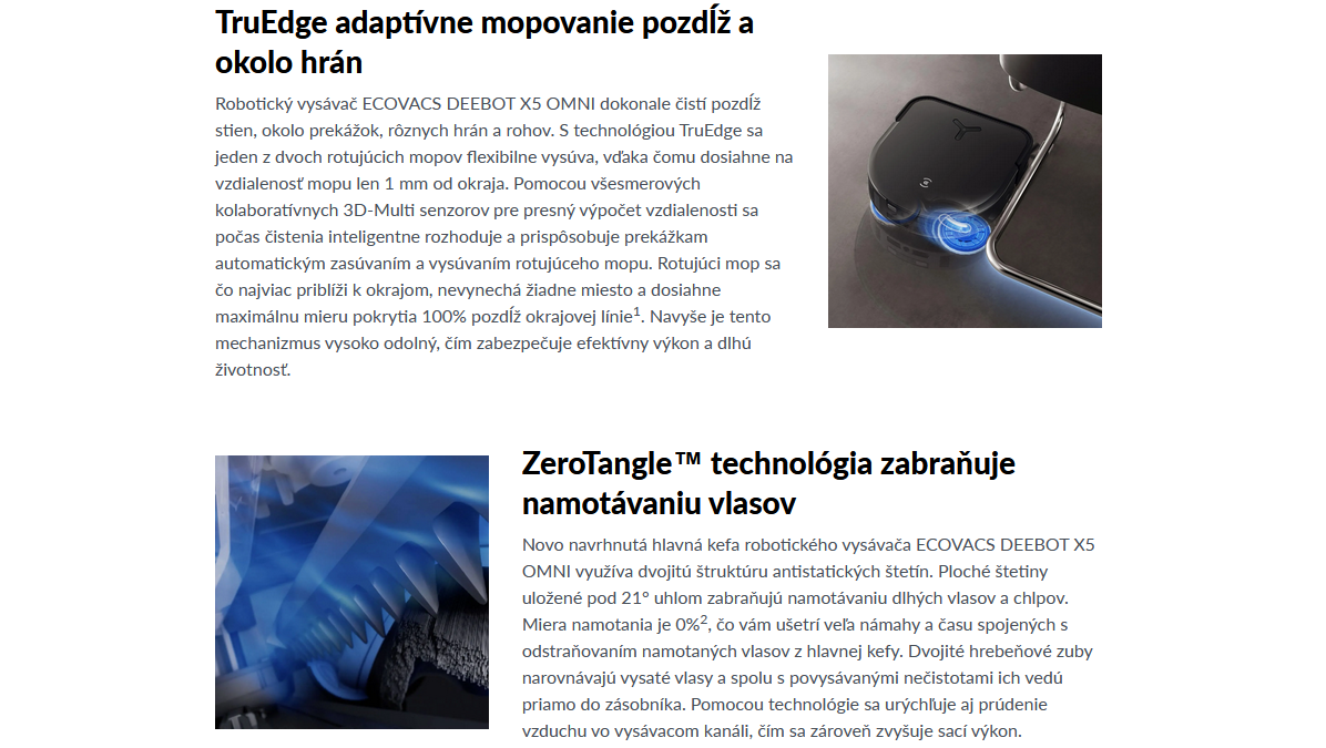 2 Testované v laboratóriu ECOVACS. Pri zametaní, zberaní a vyčesávaní pomocou rotujúceho pohybu hlavnej kefy a nasávaní vlasov kratších ako 25 cm robotickým vysávačom DEEBOT X5 OMNI je miera namotania vlasov na hlavnú kefu 0 %. Skutočné údaje sa môžu pri použití v domácnosti líšiť.