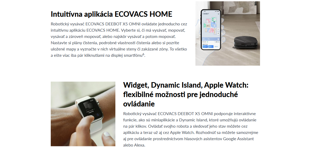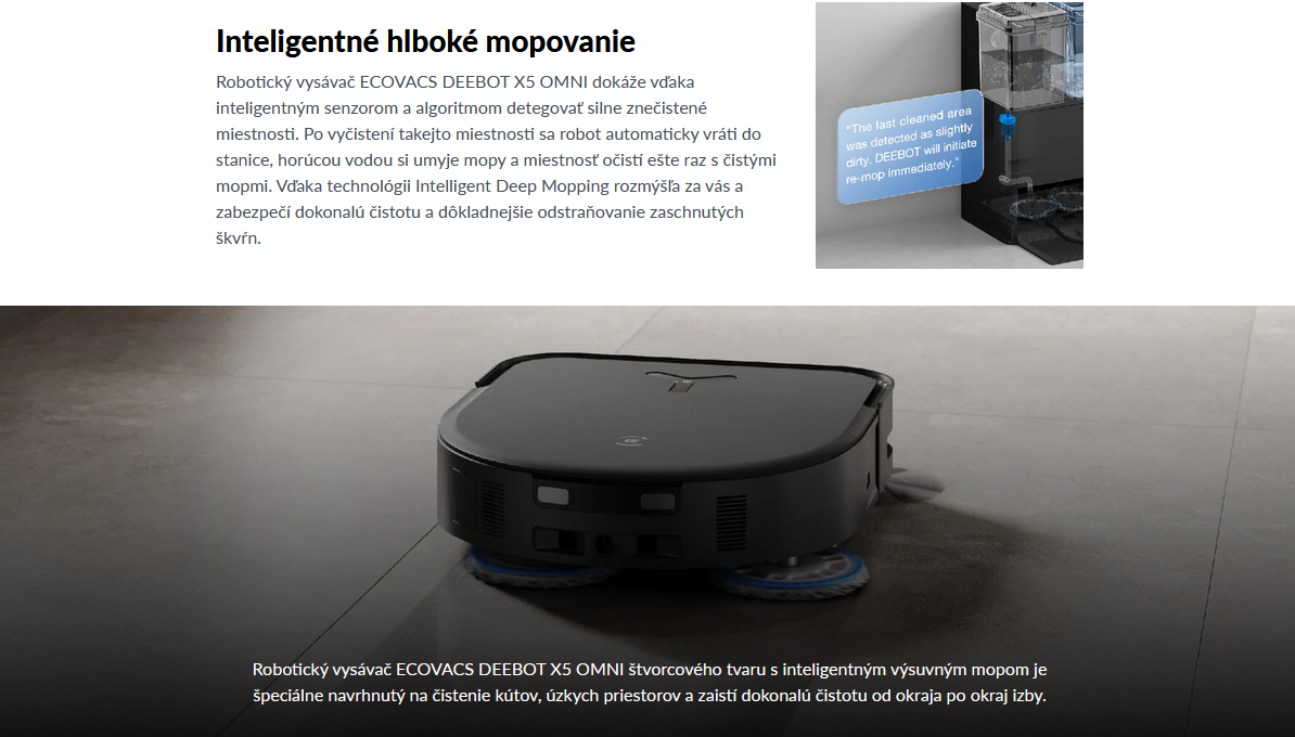 - Inteligentné hlboké mopovanie dokáže vďaka senzorom a algoritmom detegovať silne znečistené miestnosti a automaticky ich očistí dvakrát.