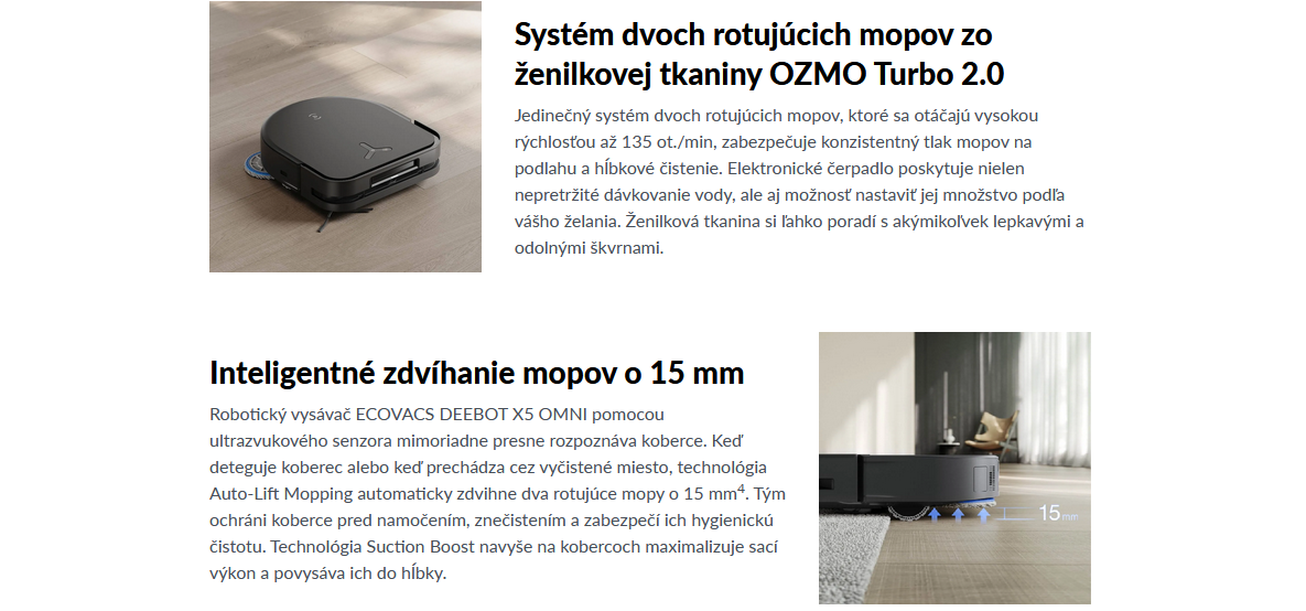- Systém dvoch rotujúcich mopov OZMO Turbo 2.0 zo ženilkovej tkaniny. Keď robot deteguje koberec, Auto-Lift Mopping System zdvihne dva rotujúce mopy až o 15 mm.