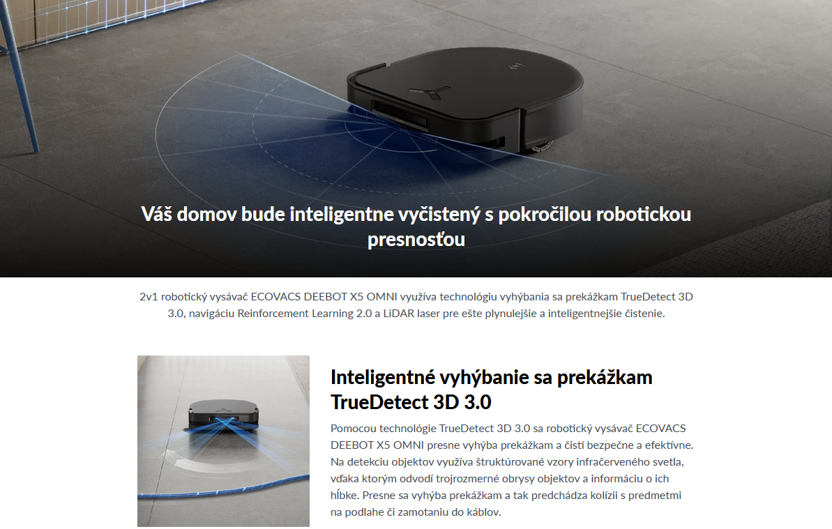 - Vďaka technológii TrueDetect 3D 3.0 sa inteligentne a presne vyhýba prekážkam na podlahe.