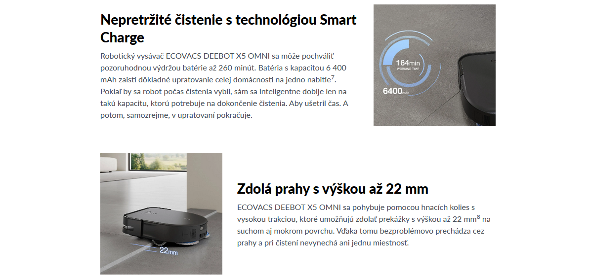 7 Testované v laboratóriu ECOVACS. Kapacita batérie robotického vysávača ECOVACS DEEBOT X5 OMNI je 6 400 mAh a výdrž batérie je až 260 minút na jedno nabitie v režime tichého vysávania a jedného prechodu. Skutočné údaje sa môžu pri použití v domácnosti líšiť.