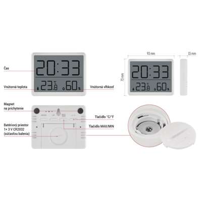 | Zobrazené údaje na displeji: | vnútorná teplota, vlhkosť a hodiny, dátum a min/max teploty |