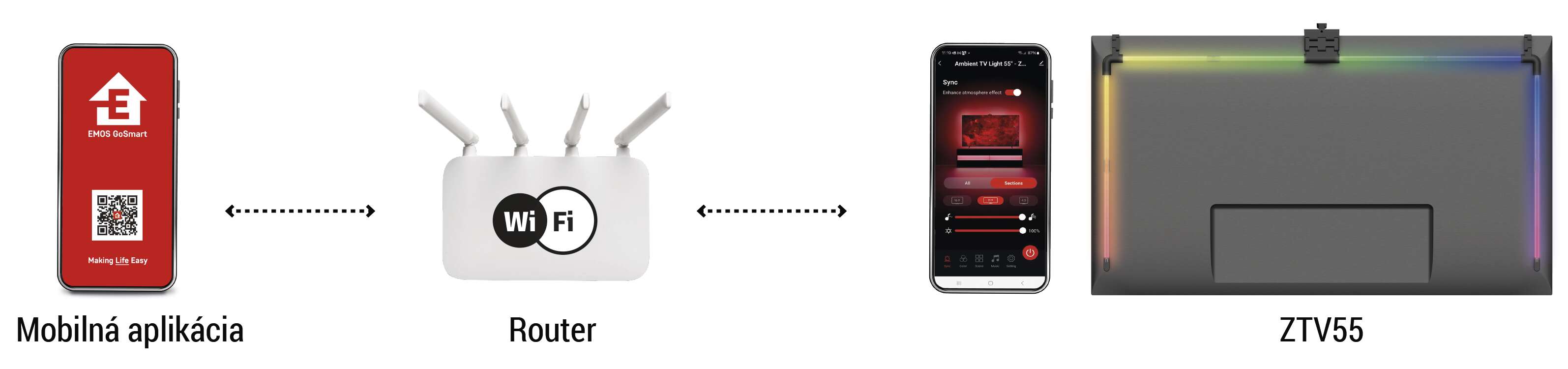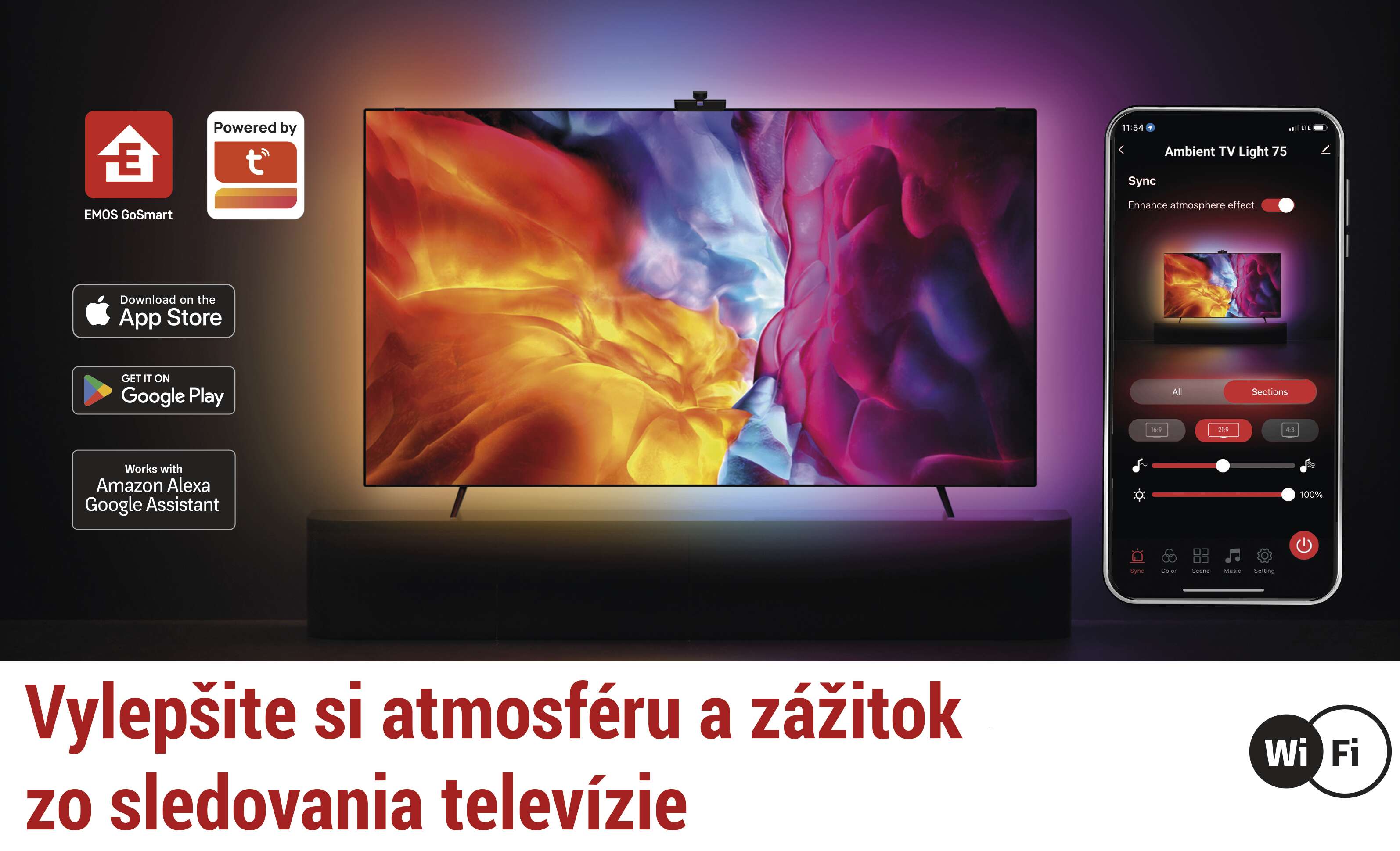 Osvetlenie GoSmart Ambient LED TV posúva zážitok zo sledovania televízora na úplne novú úroveň. Vďaka synchronizačnej kamere HD sa podsvietenie automaticky prispôsobuje farbám na obrazovke a vytvára dokonalý vizuálny efekt. Všetko ovládanie a nastavenia sa vykonávajú prostredníctvom mobilnej aplikácie EMOS GoSmart, ktorá je k dispozícii pre systémy Android aj iOS.