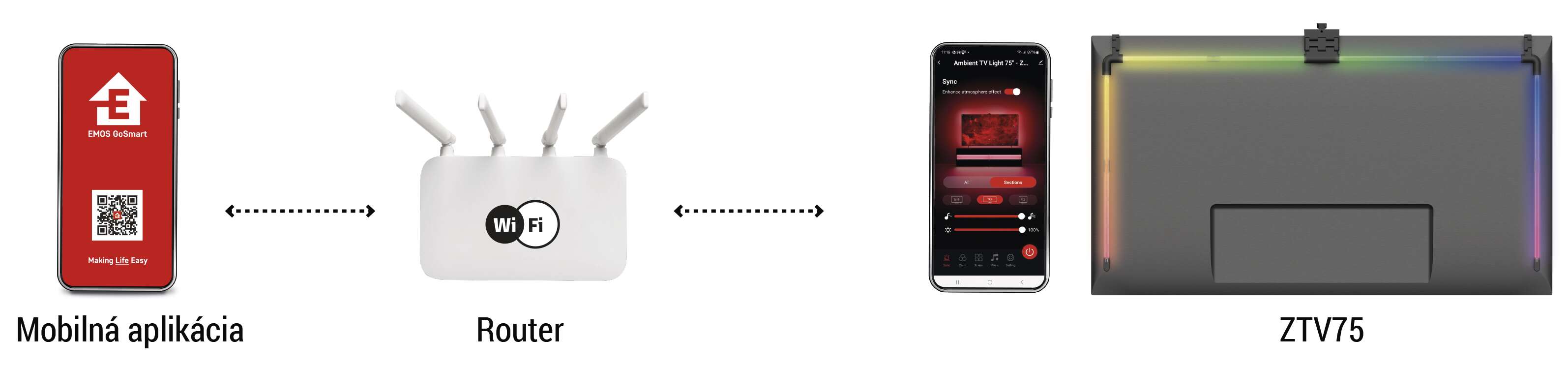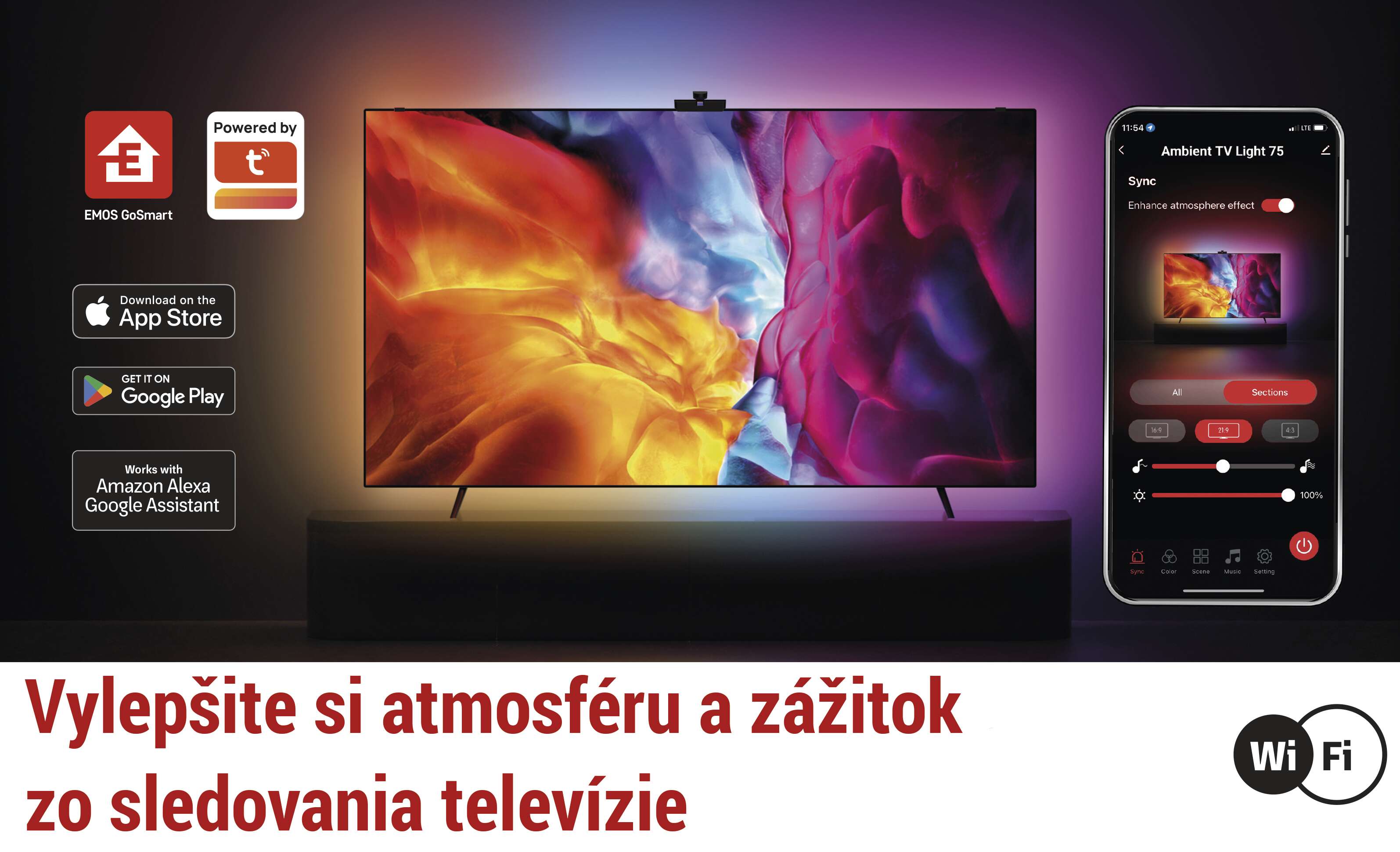 GoSmart Ambient LED TV Lighting posúva zážitok zo sledovania televízora na úplne novú úroveň. Vďaka synchronizačnej kamere HD sa podsvietenie automaticky prispôsobuje farbám na obrazovke a vytvára dokonalý vizuálny efekt. Všetko ovládanie a nastavenia sa vykonávajú prostredníctvom mobilnej aplikácie EMOS GoSmart, ktorá je k dispozícii pre systémy Android aj iOS.