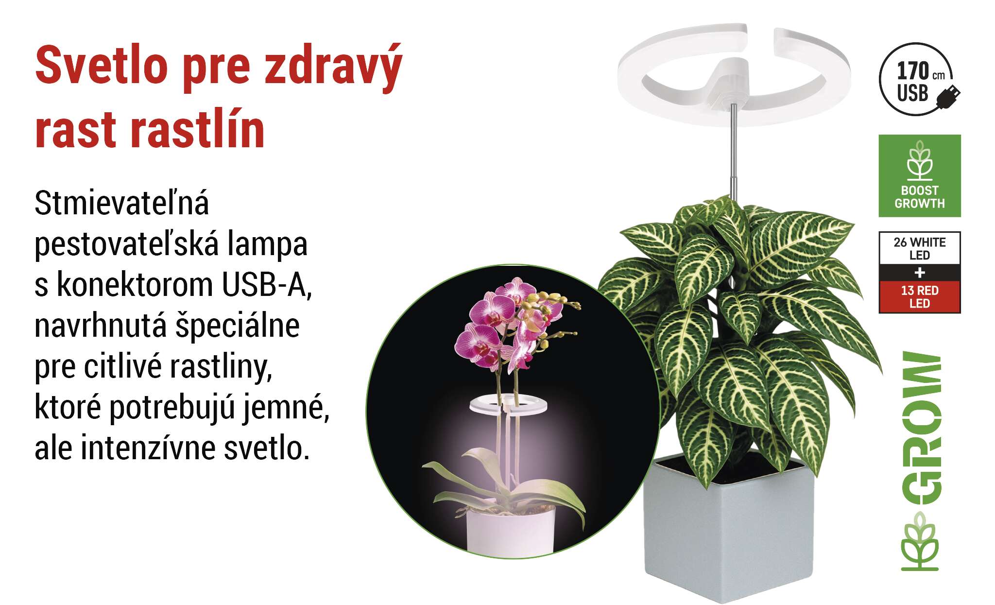 Pestovateľská lampa Z7902 je špeciálne navrhnutá pre citlivé izbové rastliny, ktoré potrebujú jemné, rovnomerné a dostatočne intenzívne osvetlenie. Vďaka kombinácii bieleho a červeného LED svetla s plným spektrom poskytuje rastlinám ideálne podmienky pre zdravý rast, bohatú zeleň a kvitnutie – po celý rok, aj na miestach s minimálnym denným svetlom.