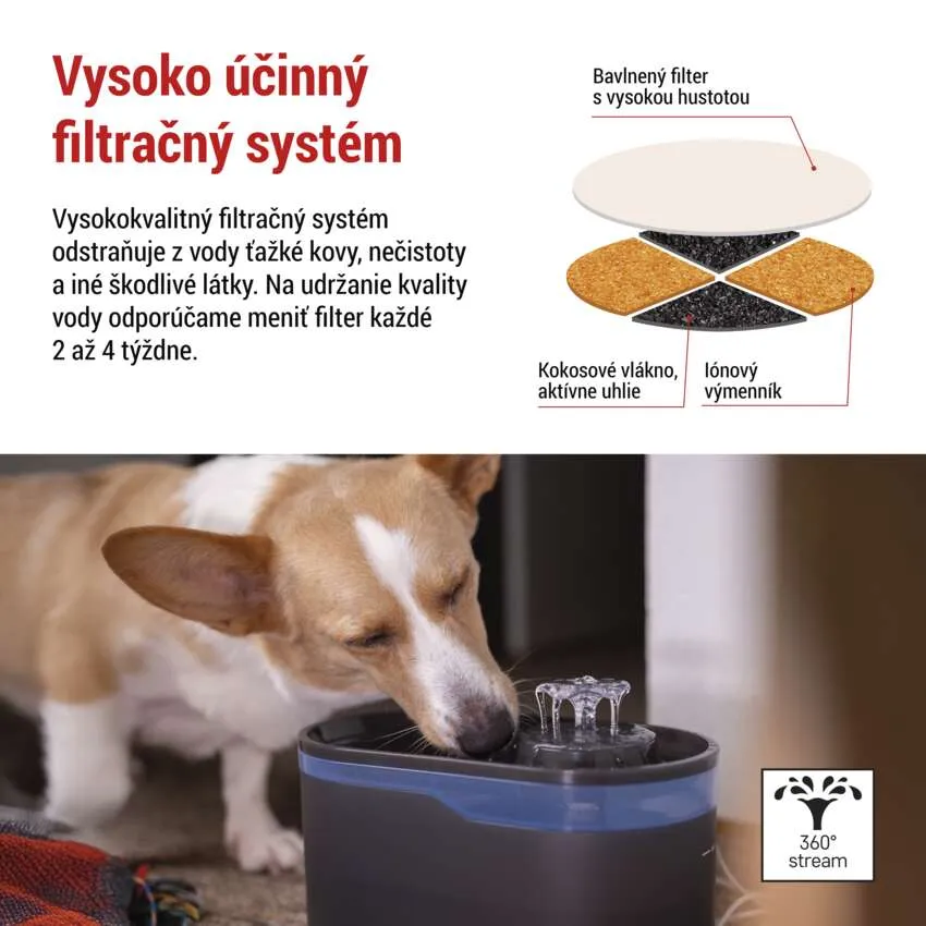 •typ produktu: vodná fontána •kapacita: 2,6 l •odporúčanie: malé a stredné plemená •rozmer: 259 × 143 × 170 mm •napájanie: 5 V/1 A •určenie: vnútorné •farba: sivá •zdroj súčasťou balenia: áno •ďalšie funkcie: filtrácia vody •obsah balenia: fontána, napájací adaptér, prívodný kábel, čerpadlo, filter k čerpadlu, bavlnený filter, čistiaca kefka |