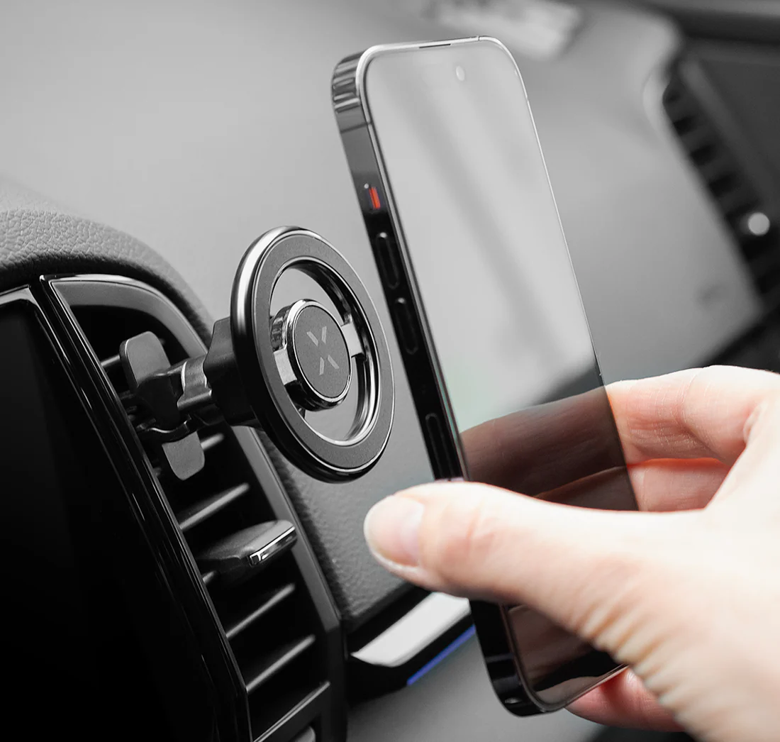 Držiak využíva silu 18 integrovaných magnetov rozmiestnených po obvode, ktoré zaistia okamžité a pevné prichytenie iPhonu s MagSafe. Telefón stačí priblížiť jednou rukou – držiak ho sám zarovná a bezpečne udrží aj pri jazde po nerovnostiach.