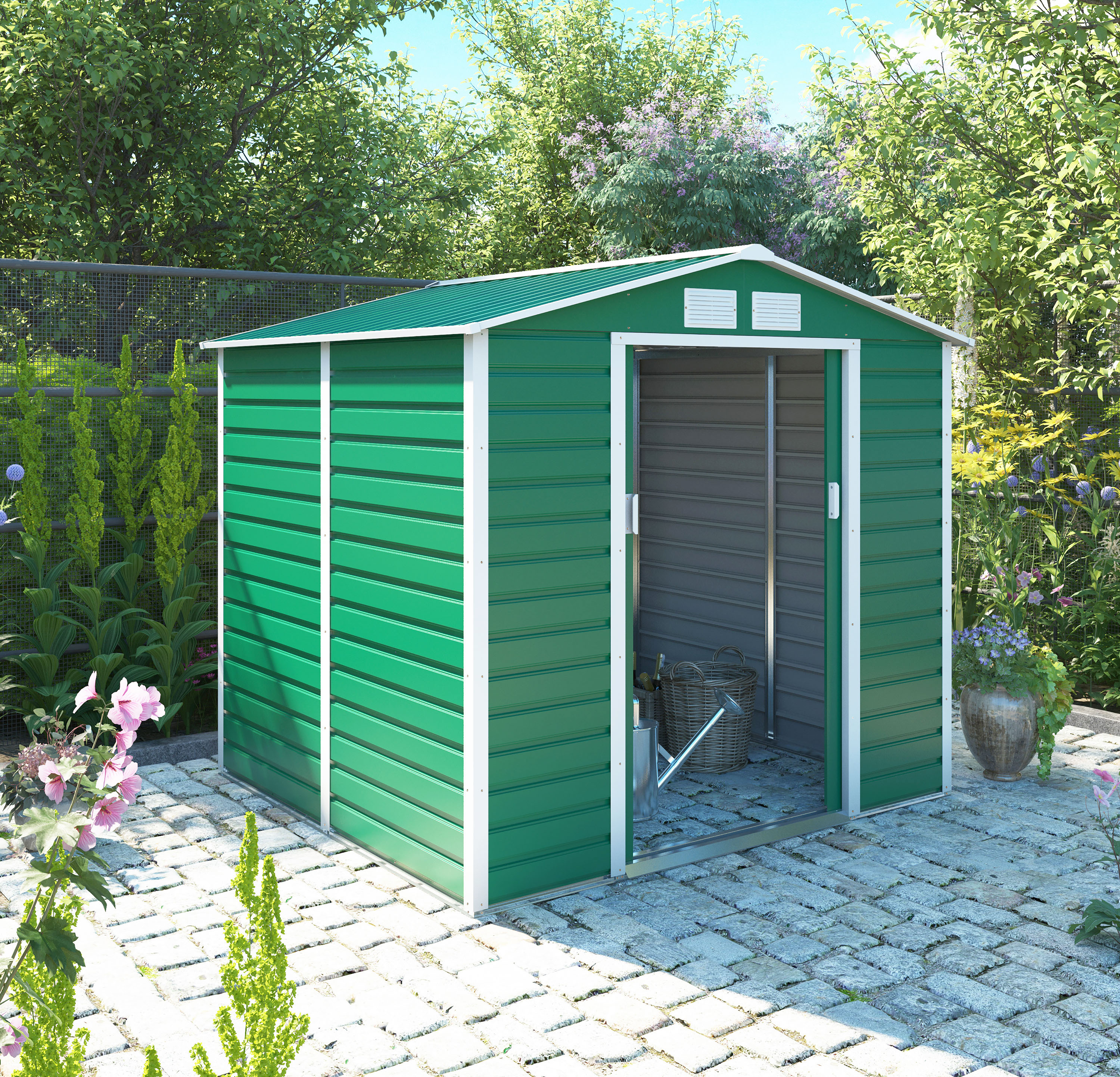 Na pevný pozinkovaný rám primontujete oceľový, pozinkovaný plech s práškovým nástrekom, ktorý je odolný voči zlému počasiu. Súčasťou balenia sú dverné úchyty, vďaka ktorým domček ľahko zaistíte proti nezvaným hosťom.