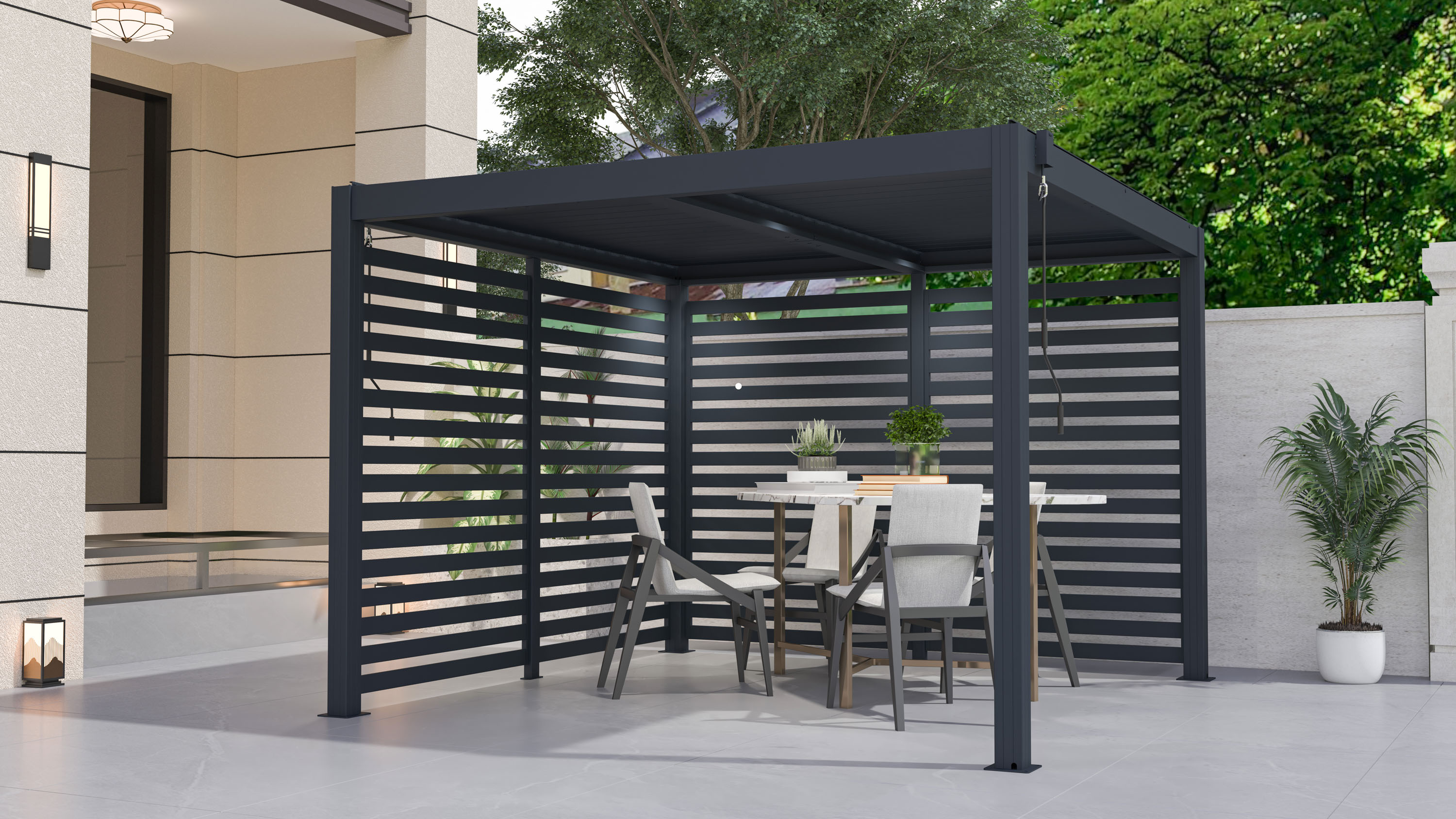Fixná lamelová stena je praktickým doplnkom pergoly Austin. Zaisťuje súkromie, väčšiu ochranu pred vetrom, dažďom aj slnkom a má moderný vzhľad. Konštrukcia je vyrobená z kvalitného hliníka, ktorý je odolný voči poveternostným vplyvom a nevyžaduje zložitú údržbu.