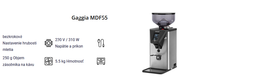 Gaggia MDF 55 je poloprofesionálny mlynček na kávu s mlecím výkonom až 2,5 gramov kávy za sekundu. Mlynček disponuje prehľadným dotykovým displejom, mlecími kameňmi z kalenej ocele s priemerom 55 mm, pogumovanou nerezovou vidlicou a patentovaným bezkrokovým systémom, ktorý umožňuje ľahko nastaviť hrubosť mletia s mikrometrickou presnosťou. Chod prístroja je navyše nadpriemerne tichý vďaka anti-vibračnej technológii, ktorej implementácia znižuje hlasitosť prístroja na iba 62 dB.