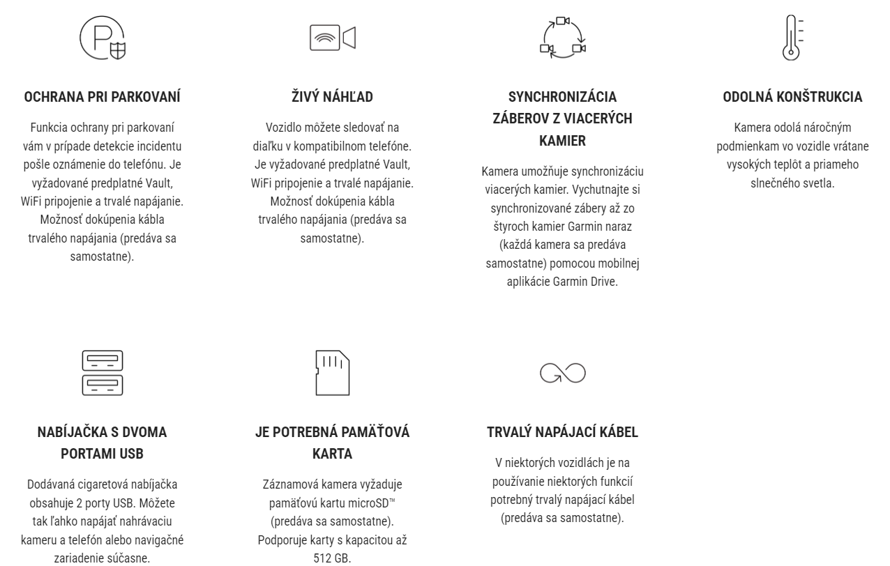 Kamera umožňuje jednoducho a bezpečne zdieľať dôležité videá. Po predplatení služby Voult a pripojení Wi-Fi® sú uložené videoklipy dostupné v aplikácii Garmin Drive v kompatibilnom telefóne.