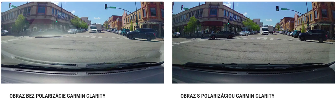 Integrovaný polarizačný objektív Garmin Clarity redukuje odlesky z čelného skla. Výsledný záznam je preto čistejší a čitateľnejší.
