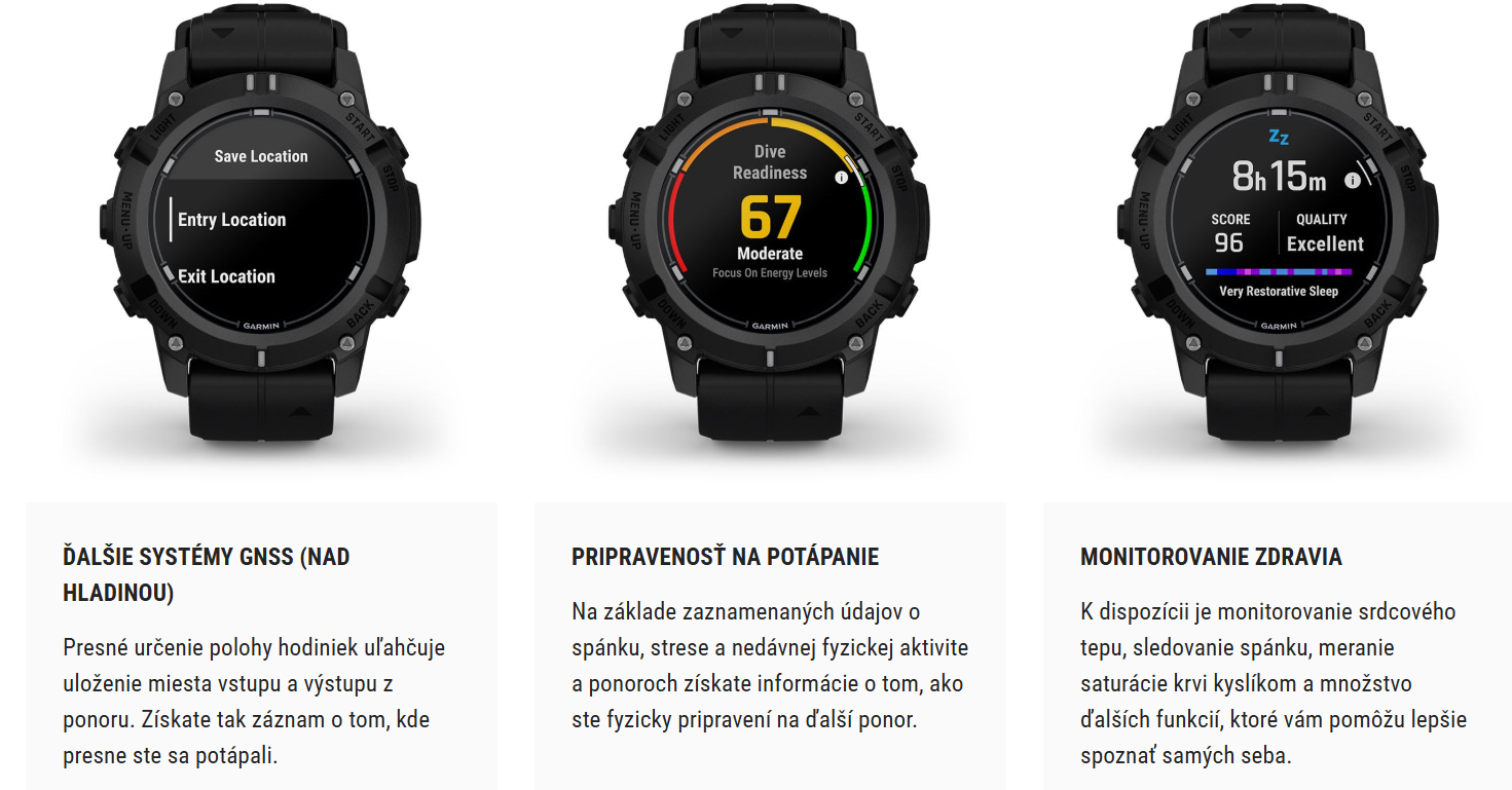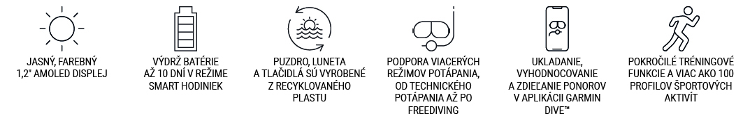 •Akumulátor - výdrž: Režim ponoru: až do 27 hodín, Režim smart hodiniek: až do 10 dní, Režim hodiniek s úsporou batérie: až do 12 dní, Režim GPS: až do 20 hodín, Režim GPS s maximálnou výdržou: až do 44 hodín, •Režim expedičnej aktivity GPS: až do 10 dní