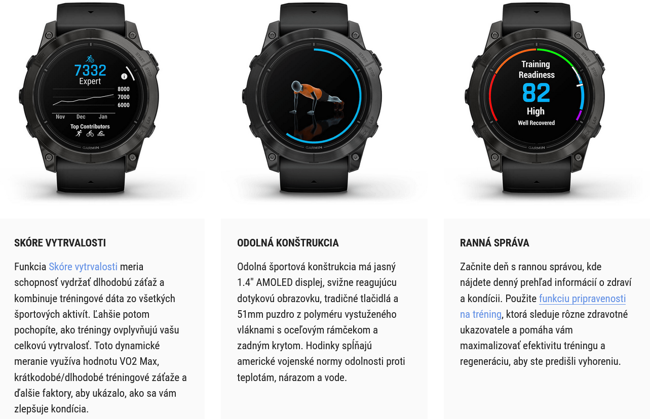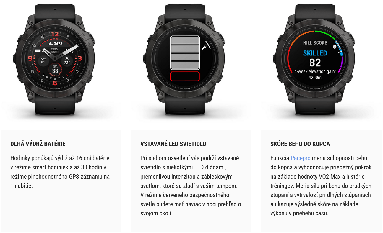 Epix™ Pro sú prémiové GPS smart hodinky vhodné pre všestranné, športovo outdoorové využitie. Ponúka pokročilé tréningové funkcie, zabudovanú výkonnú LED baterku, celodenné monitorovanie zdravia a kondície. Majú živý displej AMOLED s nepretržitou čitateľnosťou s výdržou batérie až 31 dní v režime smart hodiniek a zafírové sklíčko odolné proti poškriabaniu. Vyznačujú sa novým dizajnom optimalizovaným pre väčšie zápästia.