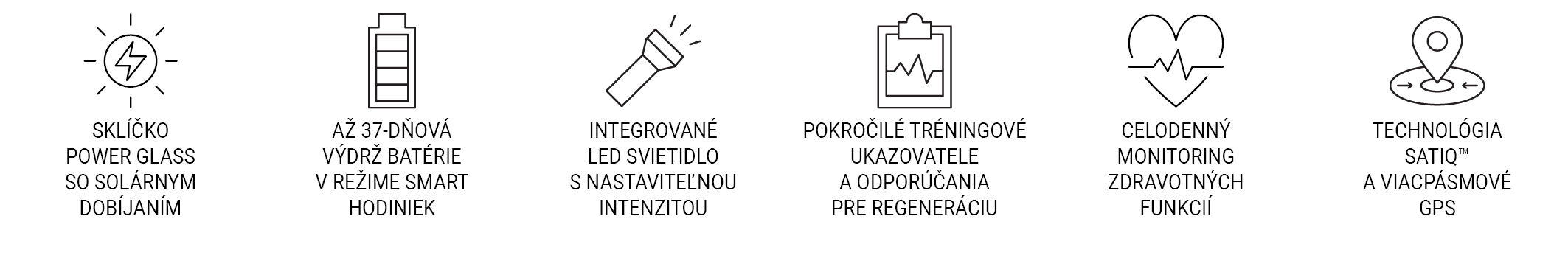 Akumulátor - výdrž: Režim smart hodiniek: až do 29 dní / 37 dní so solárnym dobíjaním*, Režim GPS: až do 89 hodín / 122 hodín so solárnym dobíjaním**, Režim Expedition GPS: až do 62 dní / 139 dní so solárnym dobíjaním*