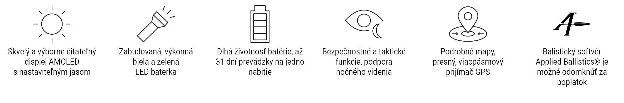 APPLIED BALLISTICS - BALISTICKÝ KALKULÁTOR Odomknite predinštalovanú Aplikovanú balistickú kalkulačku prostredníctvom aplikácie Garmin AB Synapse (za poplatok) a vypočítajte parametre mierenia na veľkú vzdialenosť. Softvér dokáže veľmi presne vykalkulovať optimálne zamierenie (smer) pri strelbe na dlhé vzdialenosti s cieľom dosiahnuť čo najvyššiu presnosť. Použitie funkcie si vyžaduje vytvorenie profilu na základe vstupných údajov ako - typ použitej zbrane a typ streliva, ktoré násladne doplníte o aktuálne poveternostné podmienky.