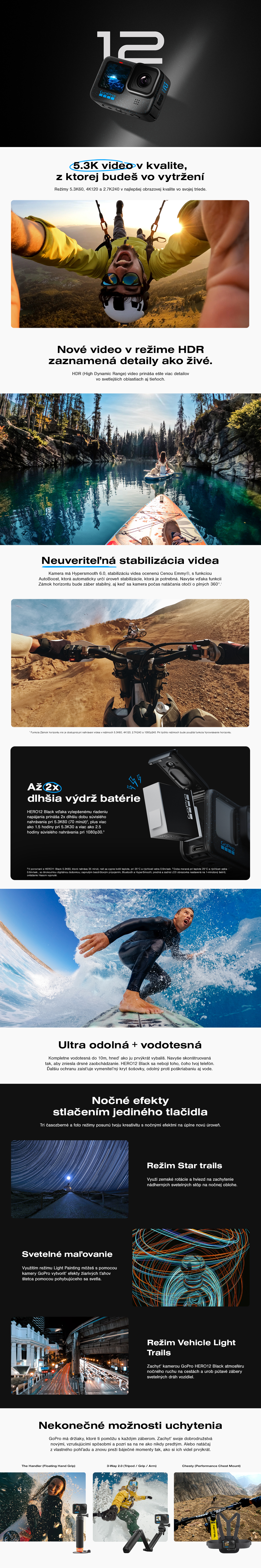Záznamové médium pre video: Pamäťová karta • Podporované pamäťové karty: microSD karta • Rozlíšenie fotoaparátu: 27.13 Mpx • Stabilizácia obrazu: HyperSmooth 6.0 • Veľkosť displeja: 2.27" • Dotykový displej: áno • Záznam v kvalite: full HD, 4K, 2,7K, 5,3K • Wi-Fi: Áno