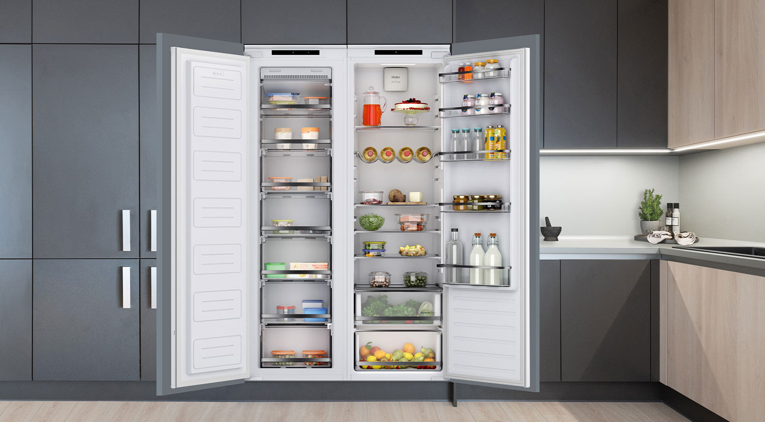 Kombinovaná chladnička Haier 1D 55 Series 6 s mrazničkou dole je dokonalou kombináciou luxusného dizajnu a špičkových funkcií. Kombinované vstavané chladničky zaručujú dlhodobé uchovanie vašich potravín vďaka dokonalému a dlhodobému chladeniu.