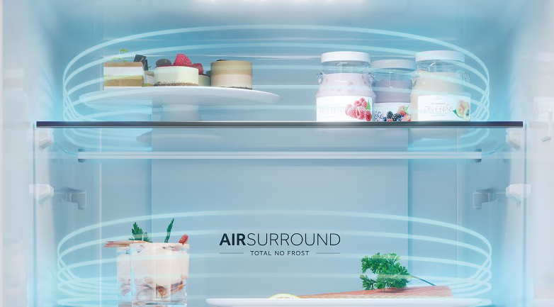 S beznámrazovou technológiou Haier Air Surround Fresher Tech prúdi vzduch vo vnútri chladničky jemnejším a šetrnejším spôsobom. Vďaka špeciálnym bočným vývodom na zadnej stene tento systém distribuuje studený vzduch homogénne v kruhoch v celom priestore chladničky. Tým bráni priamemu prúdeniu na potraviny a strate hmotnosti a vysušeniu. To je dôvod, prečo si potraviny skladované s Haier Air Surround zachovávajú chuť, konzistenciu a šťavnatosť jedla až o 99 %* po 7 dňoch ako prvý deň.