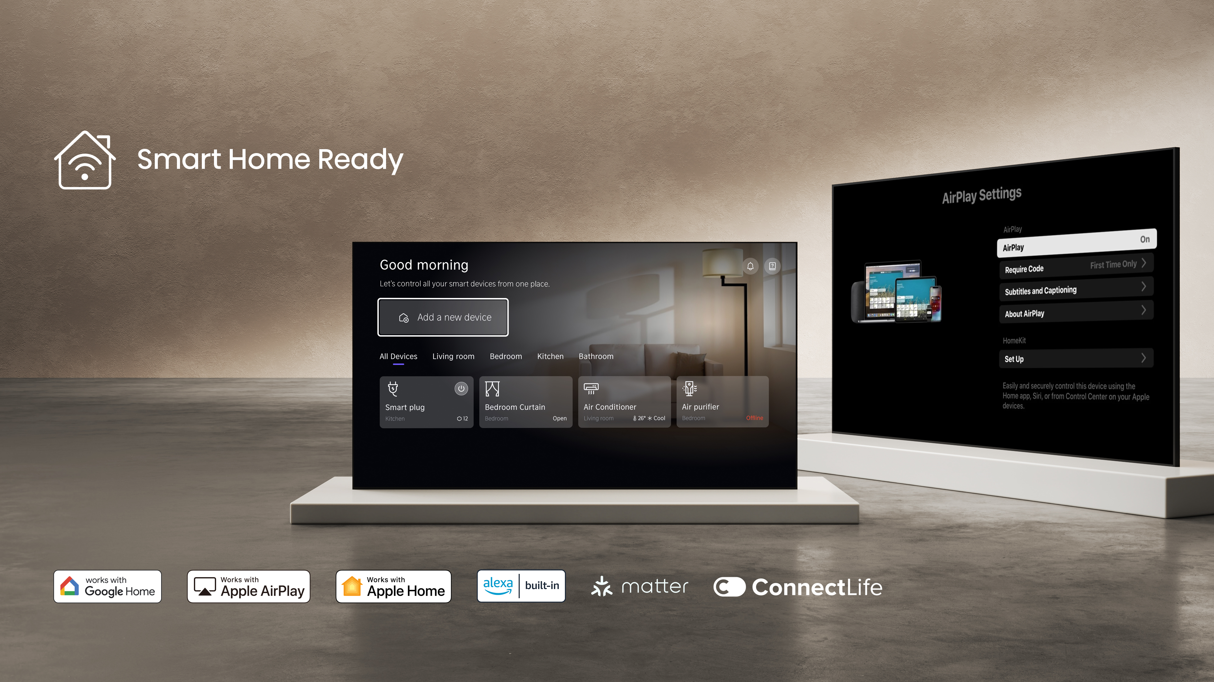 Spojte svoju chytrú domácnosť do jediného bodu ovládania. Zapnite "Film Mode" cez Google Home, Apple Home alebo Matter a ponorte sa do filmového večera, alebo sa nechajte uniesť plynulým prehrávaním hudby vo všetkých miestnostiach.