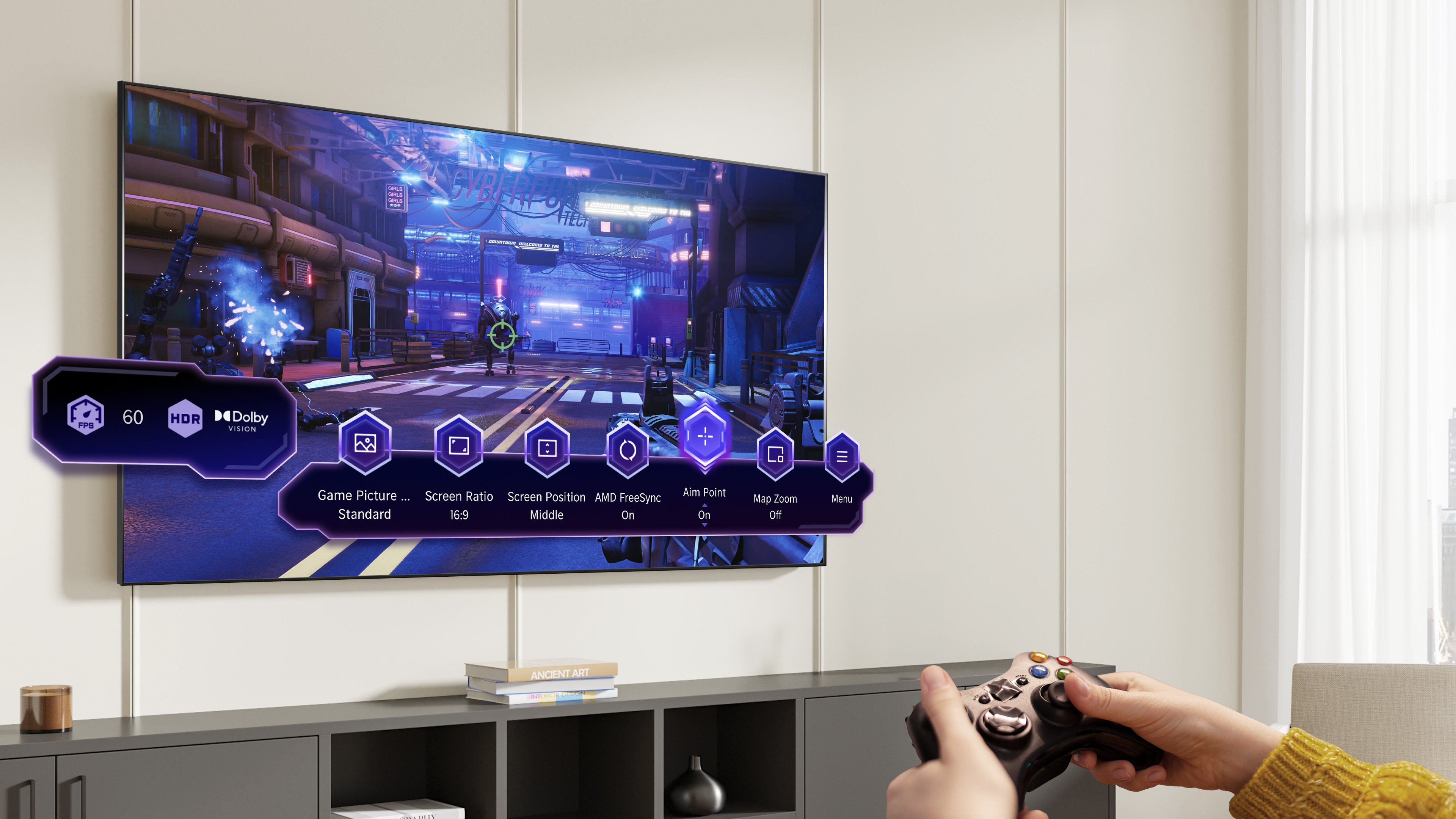 Automatický herný režim Game Mode Plus s podporou VRR disponuje herným panelom. Režim rýchlej odozvy (ALLM) sa aktivuje automaticky pri detekcii hernej konzoly. Funkcia HSR simuluje 120 Hz panel pre ešte plynulejší herný zážitok.