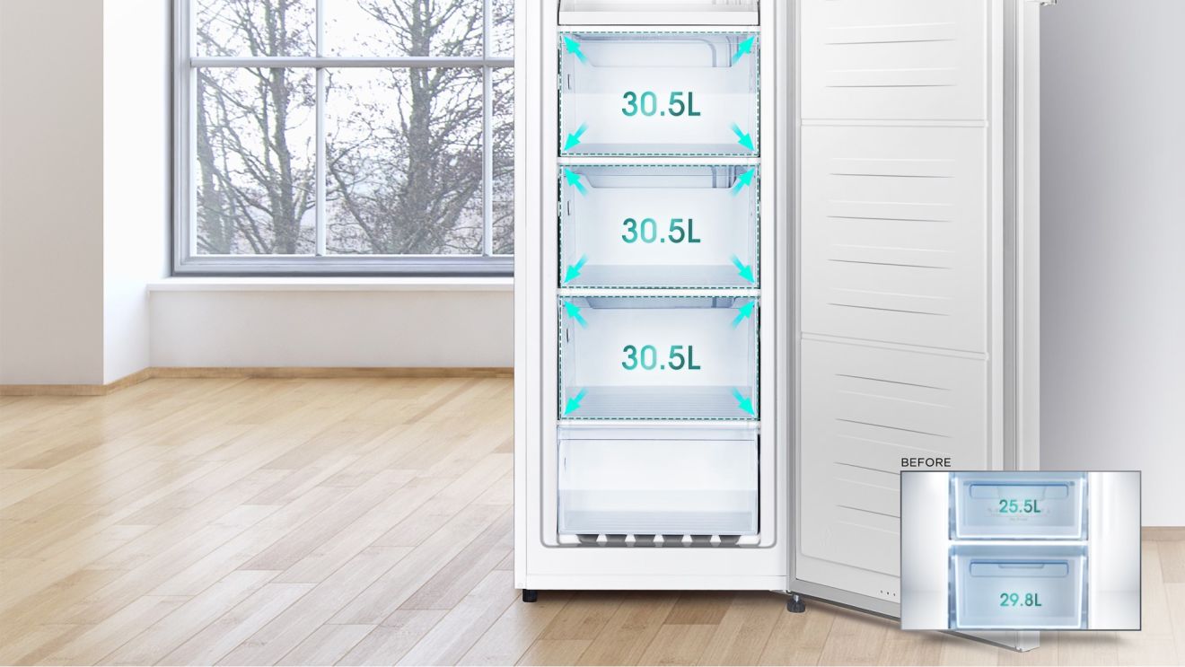 Táto skriňová mraznička poskytuje dostatok priestoru na mrazenie záhradných plodín, porcií potravín do zásoby alebo detskej výživy. Dobrú organizáciu obsahu umožňujú veľkokapacitné koše. V hornej časti sa nachádza praktická výsuvná polica, na ktorej ľahko a rýchlo nájdete uložené potraviny.