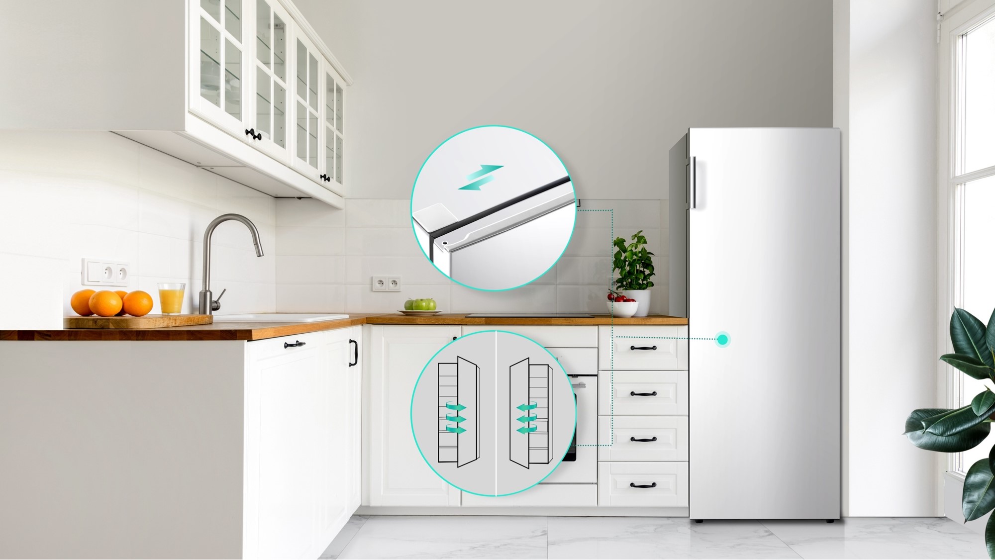 Pri tejto mrazničke si môžete vybrať, či nastavíte otváranie dverí naľavo alebo napravo. Jednoducho ich tak prispôsobíte dispozíciám kuchyne.