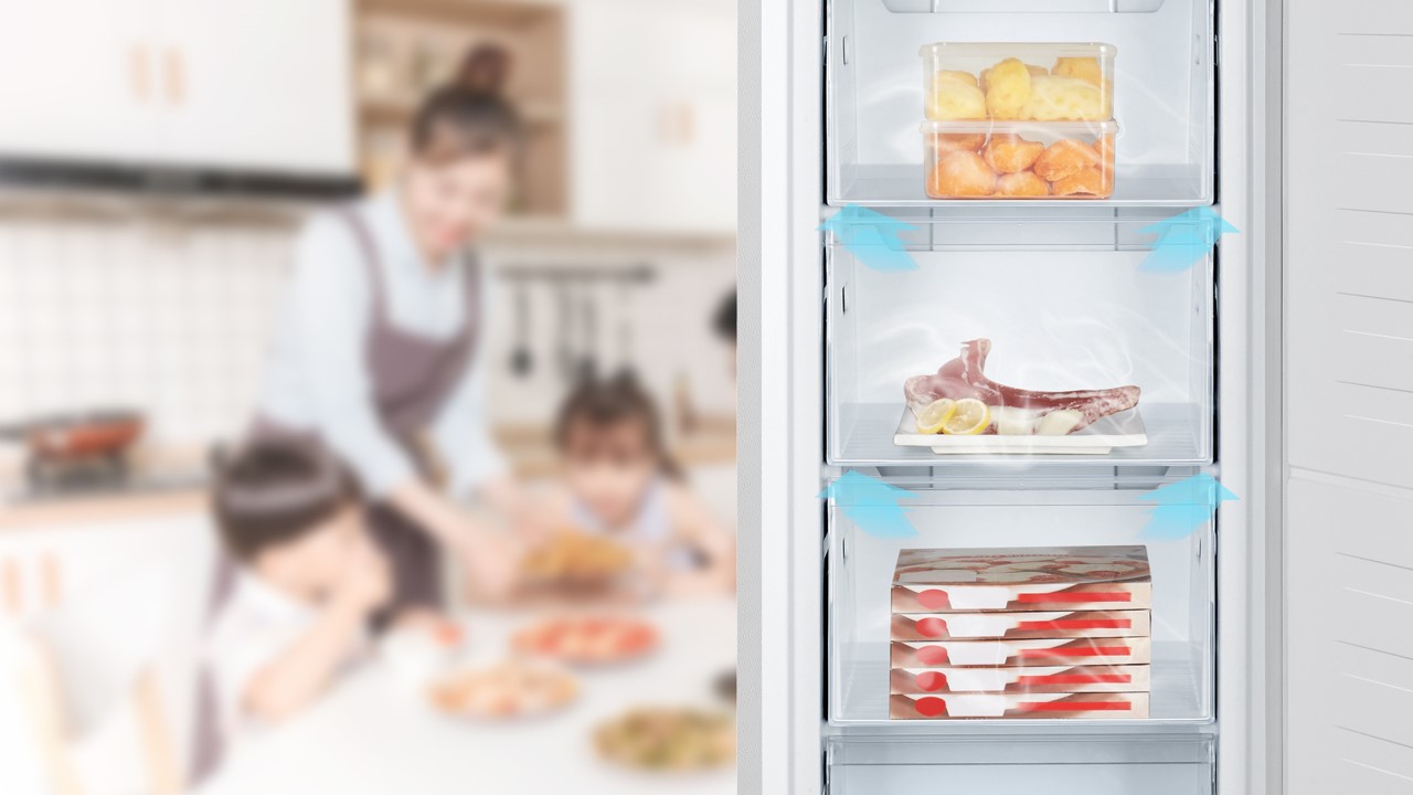 Užitočná funkcia Super Freeze rýchlo zmrazí jedlo na teplotu -18 °C, a to vďaka dvom ventilačným otvorom za horným mraziacim boxom. Potraviny si tak zachovajú lepšiu kvalitu a viac telu prospešných látok.