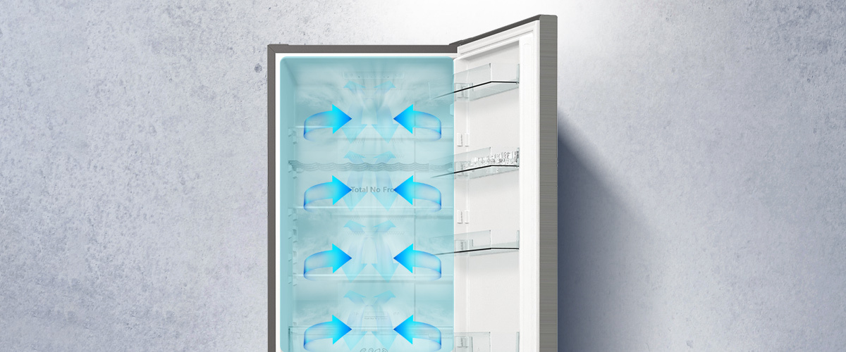 Technológia Total NoFrost predstavuje jedinečný chladiaci systém nainštalovaný priamo v mraziacom oddiele. Zabraňuje tvorbe ľadu a námrazy, vďaka čomu sa vyhnete zdĺhavému procesu odmrazovania. Výhodou je nízka spotreba energie pri zachovaní výkonu a správneho chodu chladničky. Cirkulácia ionizovaného vzduchu zabraňuje strate vlhkosti a udržuje v potravinách všetky vitamíny a minerály prospešné pre telo.