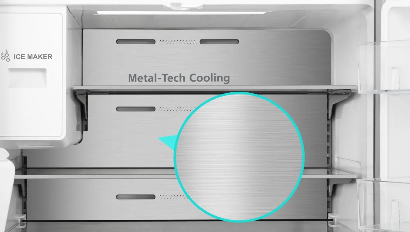 Zadná stena je pokrytá nerezovým panelom, ktorý udržiava stabilnú teplotu, pomáha ju rýchlejšie obnoviť po otvorení dverí a zabezpečuje rovnomerné prúdenie chladného vzduchu. Lesklý kovový povrch vo vnútri zároveň zvyšuje účinnosť chladenia a dodáva chladničke prémiový vzhľad.