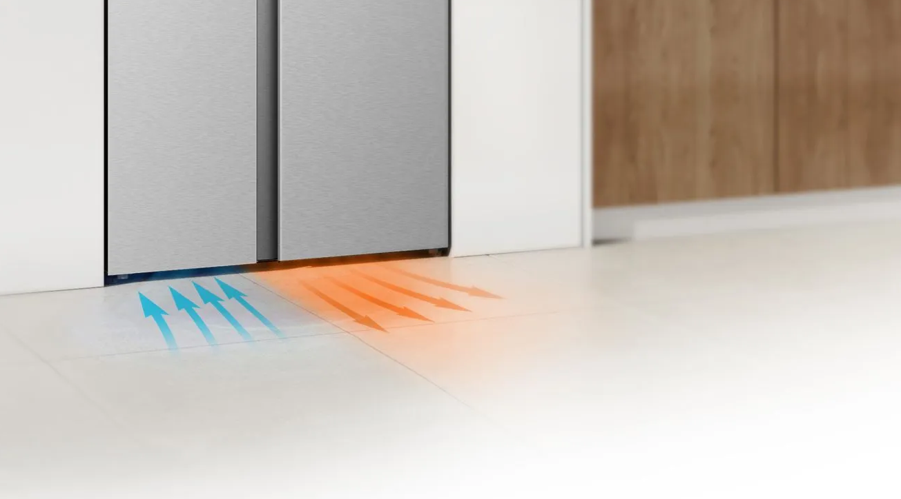 Zámerne navrhnutý systém s nasávaním vzduchu zľava a výstupom sprava účinne oddeľuje chladný vonkajší vzduch od teplého výstupného a vytvára cirkuláciu medzi spodnou časťou chladničky a podlahou. Tento systém zvyšuje energetickú účinnosť a umožňuje inštaláciu do kuchynskej linky.