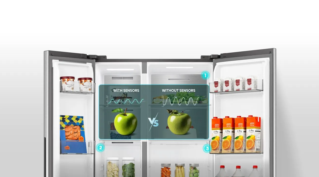 Chladnička obsahuje viacero digitálnych senzorov teploty, ktoré optimálne regulujú teplotu chladenia a mrazenia.