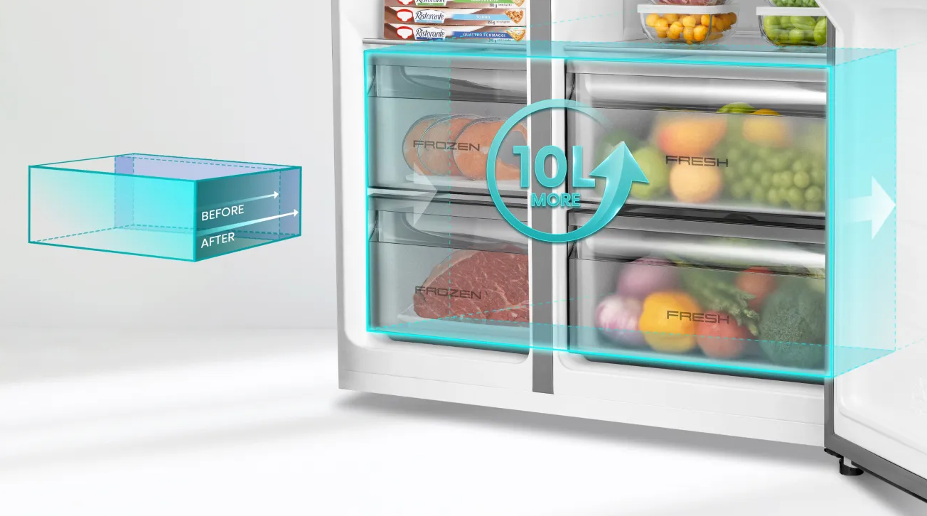 Premyslený dizajn plochého vzduchového kanálu umožňuje maximálne využitie vnútorného priestoru chladničky bez narušenia jej čistého a elegantného vzhľadu. Zjednodušené vnútorné usporiadanie zároveň zabezpečuje jednoduché čistenie a pohodlnú údržbu.
