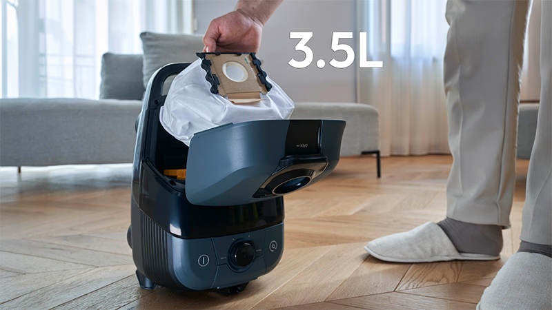Menej časté prerušovanie vďaka extra veľkému objemu vrecka 3,5 l pre dlhotrvajúce upratovanie. Navyše minimalizuje kontakt s prachom vďaka hygienickému a jednoduchému systému výmeny vreciek.