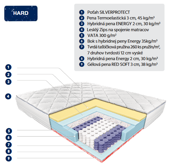 | Zloženie matracového jadra: | Taštičková pružina, Hybridná pena Energy, Vata, Termoelastycká pena, Gélová pena RED SOFT |