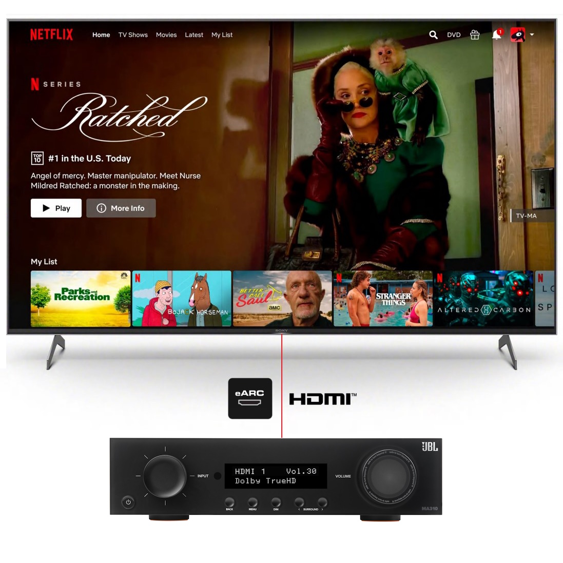Súčasné inteligentné televízory sa stávajú stredobodom domácej zábavy. Vďaka YOUTUBE a streamovacím službám ako sú NETFLIX, HBO, DISNEY+ a O2TV má užívateľ prostredníctvom televízora okamžitý prístup k neobmedzenej ponuke videí, filmov aj hudby. Televízor môže byť súčasne prepojený aj s hernou konzolou, smartfónom, multimediálnym centrom alebo počítačom. Hoci tieto zariadenia bežne poskytujú viackanálový priestorový zvuk Dolby a DTS, neplatí to o interných reproduktoroch televízora. Skutočne realistický pohlcujúci a obklopujúci zvuk a skutočný zážitok zo sledovania filmu alebo hrania hier umožňuje až pripojenie AV procesora a zosilňovača so systémom reproduktorov. JBL MA310 je najjednoduchším spôsobom, ako zo svojej obývačky vytvoriť skutočnú kinosálu. Stačí ho prepojiť s televízorom jediným káblom HDMI ARC a začať využívať všetky jeho možnosti. Jednoduchšie to už byť nemôže.