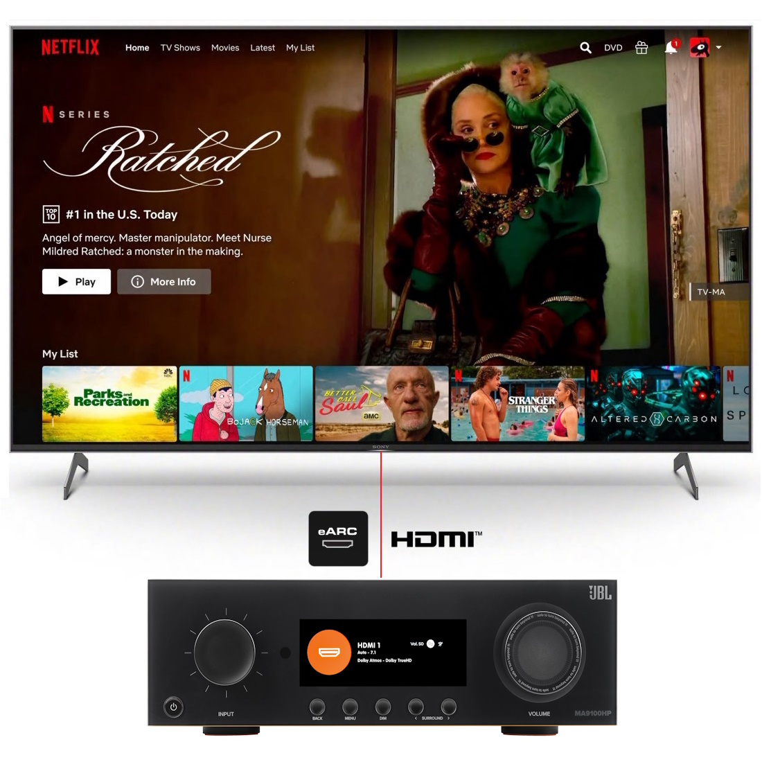 Súčasné inteligentné televízory sa stávajú stredobodom domácej zábavy. Vďaka YOUTUBE a streamovacím službám ako sú NETFLIX, HBO, DISNEY+ a O2TV má užívateľ prostredníctvom televízora okamžitý prístup k neobmedzenej ponuke videí, filmov aj hudby. Televízor môže byť súčasne prepojený aj s hernou konzolou, smartfónom, multimediálnym centrom alebo počítačom. Hoci tieto zariadenia bežne poskytujú viackanálový priestorový zvuk Dolby ATMOS a DTS-X, neplatí to o interných reproduktoroch televízora. Skutočne realistický pohlcujúci a obklopujúci zvuk a skutočný zážitok zo sledovania filmu alebo hrania hier umožňuje až pripojenie AV procesora a zosilňovača so systémom niekoľkých reproduktorov. JBL MA9100HP je perfektným spôsobom, ako zo svojej obývačky vytvoriť naozajstný kinosála. Stačí ho prepojiť s televízorom jediným káblom HDMI eARC a začať využívať všetky jeho možnosti.