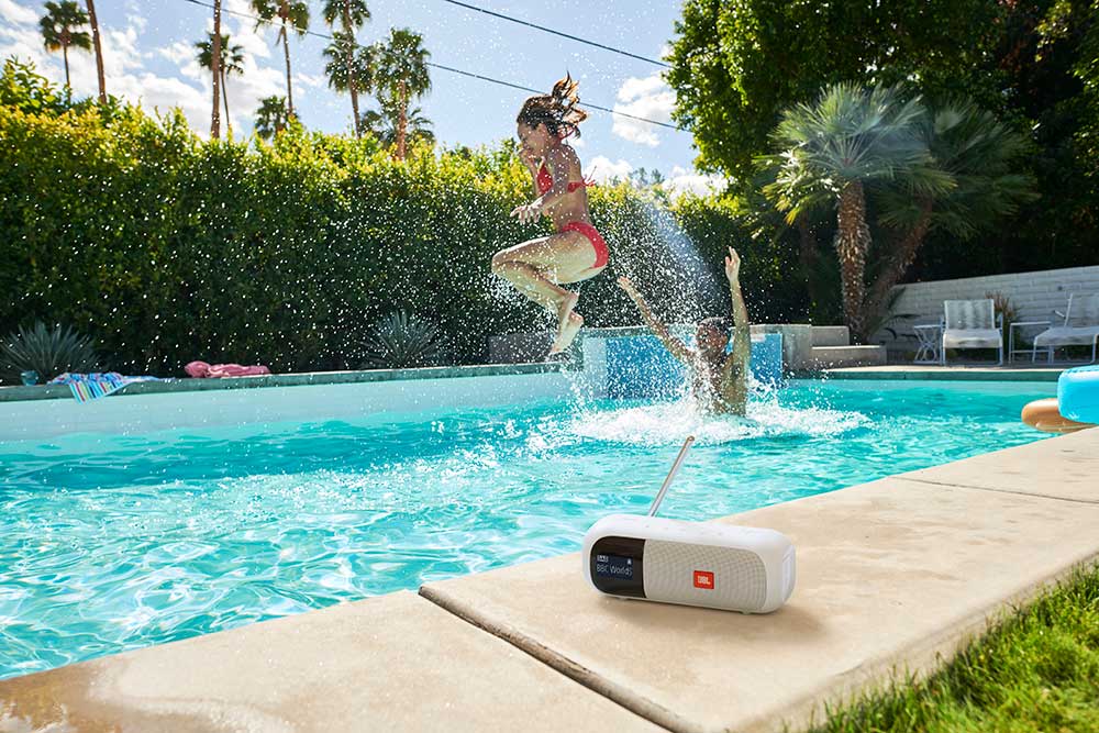 Vezmite si svoje obľúbené stanice do parku alebo k bazénu. JBL Tuner 2 je ohodnotený vodotesnosťou triedy IPX7, takže ho môžete počúvať takmer kdekoľvek.