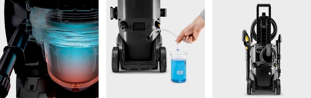 K 4 WCM zaujme výkonným vodou chladeným motorom, ktorý sa vyznačuje dlhou životnosťou. Tlaková umývačka so 6 metrovou vysokotlakovou hadicou bola skonštruovaná na príležitostné použitie a mierne znečistenie. Vďaka plochej tryske Vario Power a rotačnej tryske je možné podľa potreby čistiť terasy, záhradný nábytok a vozidlá. Tlak vody je možné presne prispôsobiť konkrétnemu čistenému objektu jednoduchým otočením trysky. Okrem toho rotačná tryska s bodovým lúčom zaisťuje úspešné čistenie bez kompromisov aj pri odolných nečistôt. Všetko príslušenstvo je možné uložiť priamo na prístroji. Vstavaný vodný filter spoľahlivo chráni čerpadlo pred čiastočkami nečistôt.