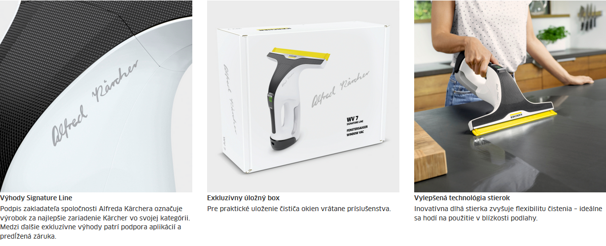 Iba naše najinovatívnejšie a najvýkonnejšie výrobky nesú podpis technologického priekopníka a zakladateľa spoločnosti Alfreda Kärchera. Nový rad WV 7 Signature Line: na prvý pohľad rozpoznateľný ako najlepšie zariadenie vo svojej produktovej kategórii Kärcher a náš nový štandard v oblasti čističov okien. Jeho elegantný dizajn, zredukovaný len na to podstatné, robí čistenie ešte pohodlnejším a jednoduchším. Jedinečné funkcie ako je podpora aplikácie pre počiatočné spustenie, tipy na čistenie či vylepšená sacia hubica ešte viac uľahčujú vrátenie WOW efektu oknám a všetkým hladkým povrchom.
