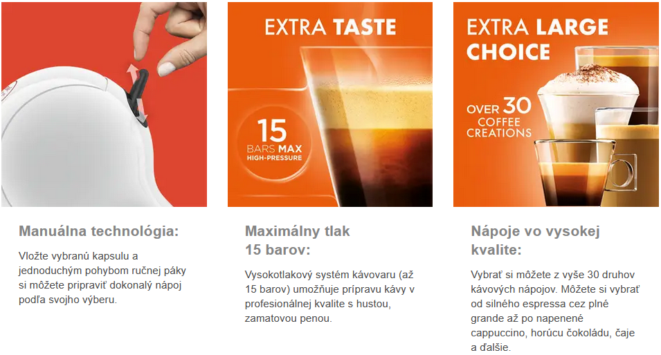S výrobkom NESCAFÉ® Dolce Gusto® si môžete vychutnať viac ako 30 prvotriednych kávových kreácií, kedykoľvek budete chcieť: kávu malú alebo veľkú, čiernu alebo bielu. Zvoľte povzbudzujúce ristretto, silné espreso, aromatické lungo alebo grande s plnou chuťou, prípadne si vychutnajte cappuccino s mliečnou penou, zamatové latte macchiato alebo dokonca horúcu čokoládu či studené nápoje.