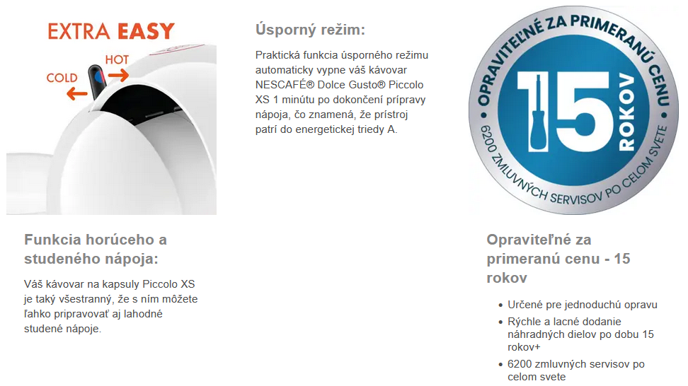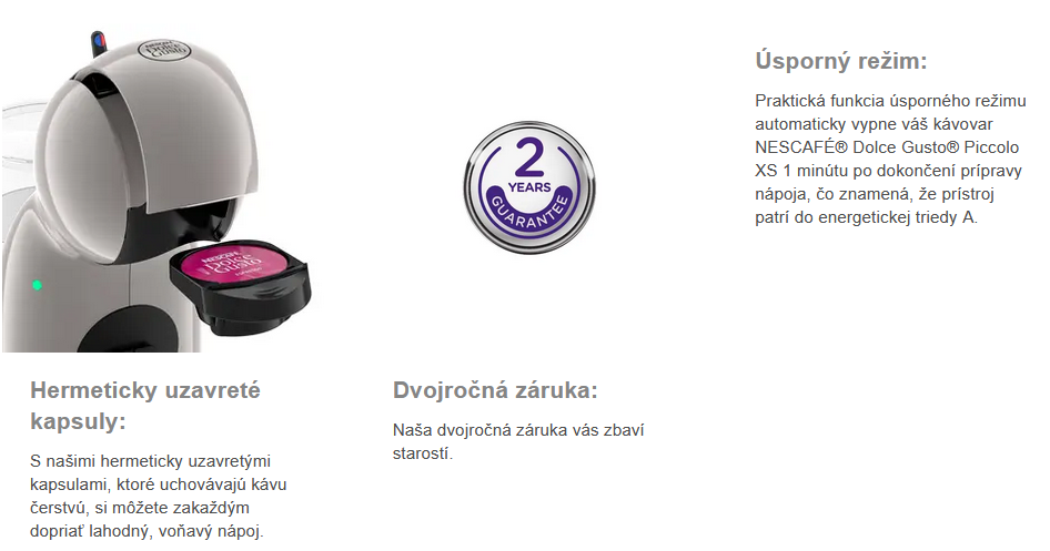 Praktická funkcia úsporného režimu automaticky vypne váš kávovar NESCAFÉ® Dolce Gusto® Piccolo XS 1 minútu po dokončení prípravy nápoja, čo znamená, že prístroj patrí do energetickej triedy A.