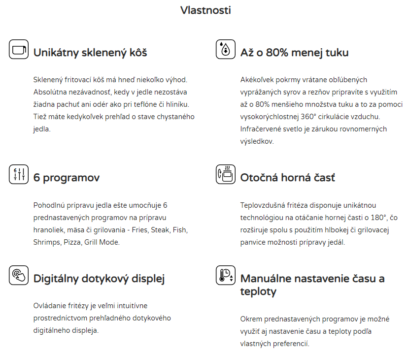 Prostredníctvom prehľadného digitálneho displeja intuitívne zvolíte niektorý z 6 prednastavených programov na fritovanie hranoliek, mäsa či grilovanie - Fries , Steak, Fish, Shrimps, Pizza, Grill Mode. Čas aj teploty si však nastavíte podľa potreby i manuálne. Vďaka unikátnemu sklenenému košu s viditeľnosťou 360° a vnútornému osvetleniu máte stále prehľad o priebehu prípravy pokrmov. Použitý materiál navyše nezanecháva žiadnu pachuť alebo odér v jedle.