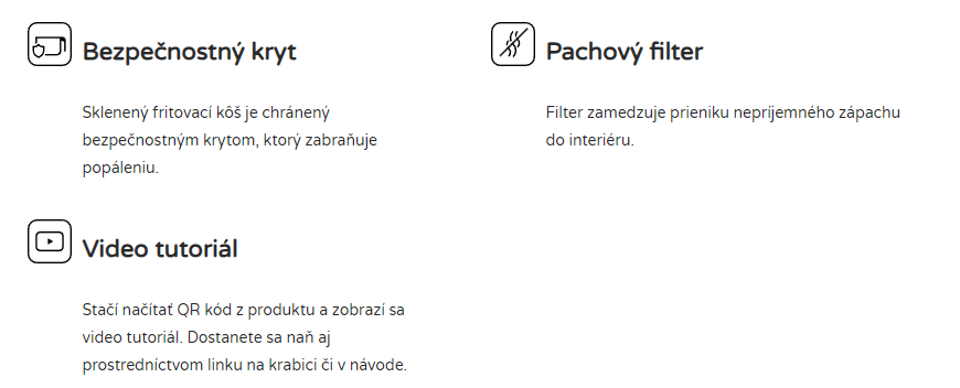 Sklenený fritovací kôš je chránený bezpečnostným krytom, nemusíte sa teda obávať popálenia ani zvedavých detí. Interiér bytu je tiež v bezpečí, pachový filter zabraňuje prieniku nechceného zápachu do priestoru. Údržba fritézy je ešte rýchlejšia ako samotné varenie, stačí príslušenstvo vložiť do umývačky riadu. Aj keď je používanie prístroja veľmi jednoduché, po načítaní QR kódu si máte možnosť pustiť krátky video tutoriál s prehľadným návodom.