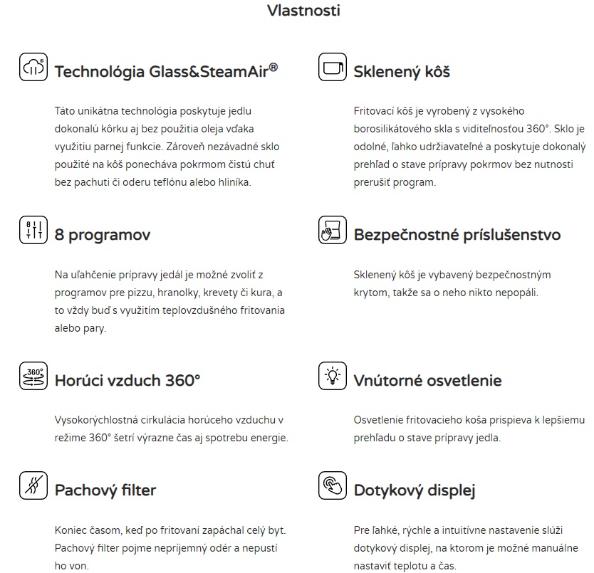 Teplovzdušná fritéza s objemom 4,5 l je dokonalým spoločníkom pri nastoľovaní zdravého životného štýlu. Vyprážanie horúcim vzduchom potrebuje na prípravu jedla až o 80% menej tuku, prípadne nie je potrebné použiť žiadny. Vaše pokrmy sa budú pýšiť parádnou chrumkavou kôrkou, ku ktorej dopomáha parná funkcia, zároveň sa rozplynú na jazyku bez toho, aby bola cítiť akákoľvek pachuť či odér teflónu alebo hliníka. Sklenený kôš totiž zaisťuje úplnú čistotu chuti. Celé kúzlo tkvie v unikátnej technológii Glass&SteamAir®.