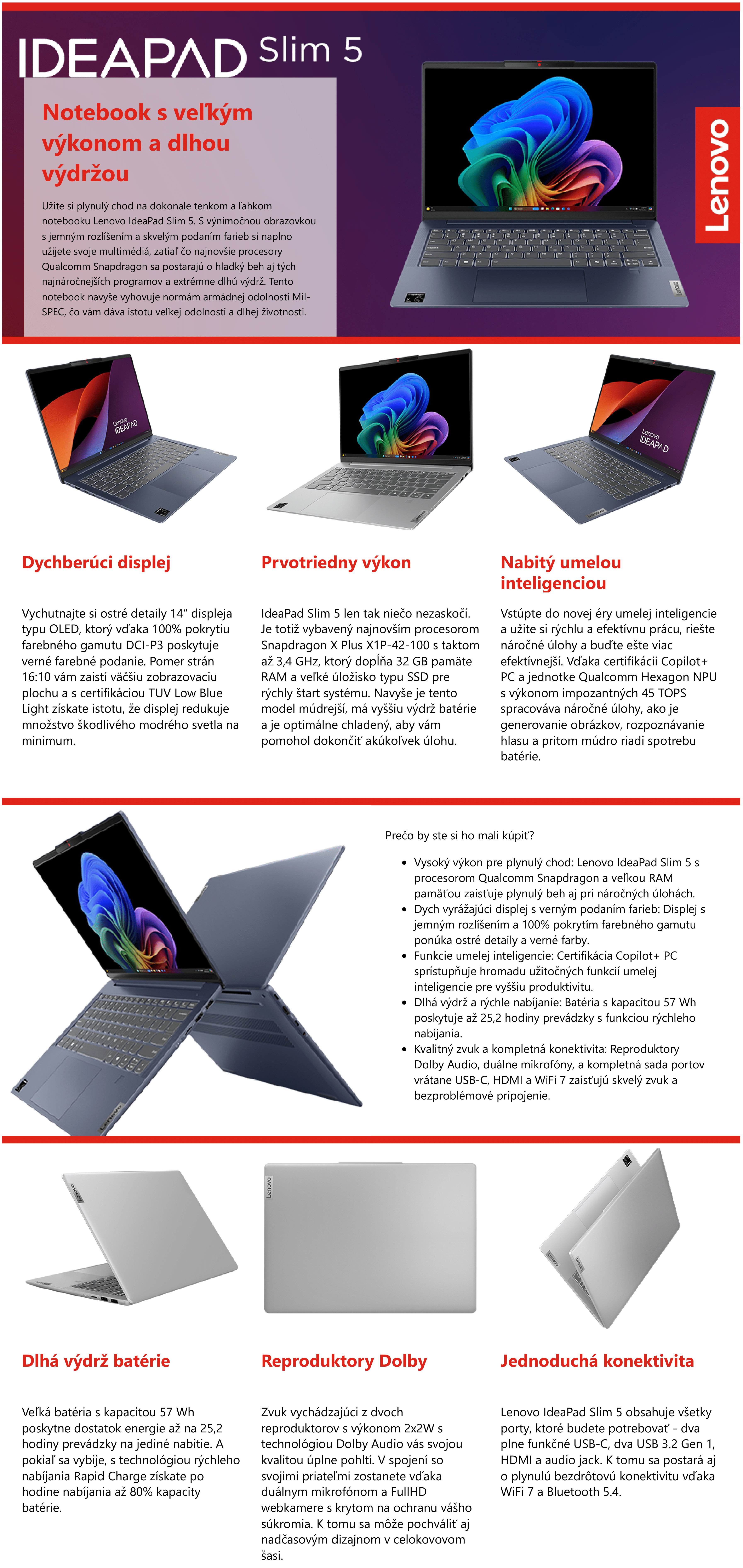 Displej: 14" WUXGA (1920x1200) • Procesor: Qualcomm Snapdragon X Plus X1P-42-100 až 3.4 GHz • Grafická karta: Qualcomm • Pamäť RAM: LPDDR5 32 GB • Úložný priestor: SSD: 1 TB • Operačný systém: Windows 11 Pro 64-bit • Podsvietená klávesnica: áno • Dotykový: nie