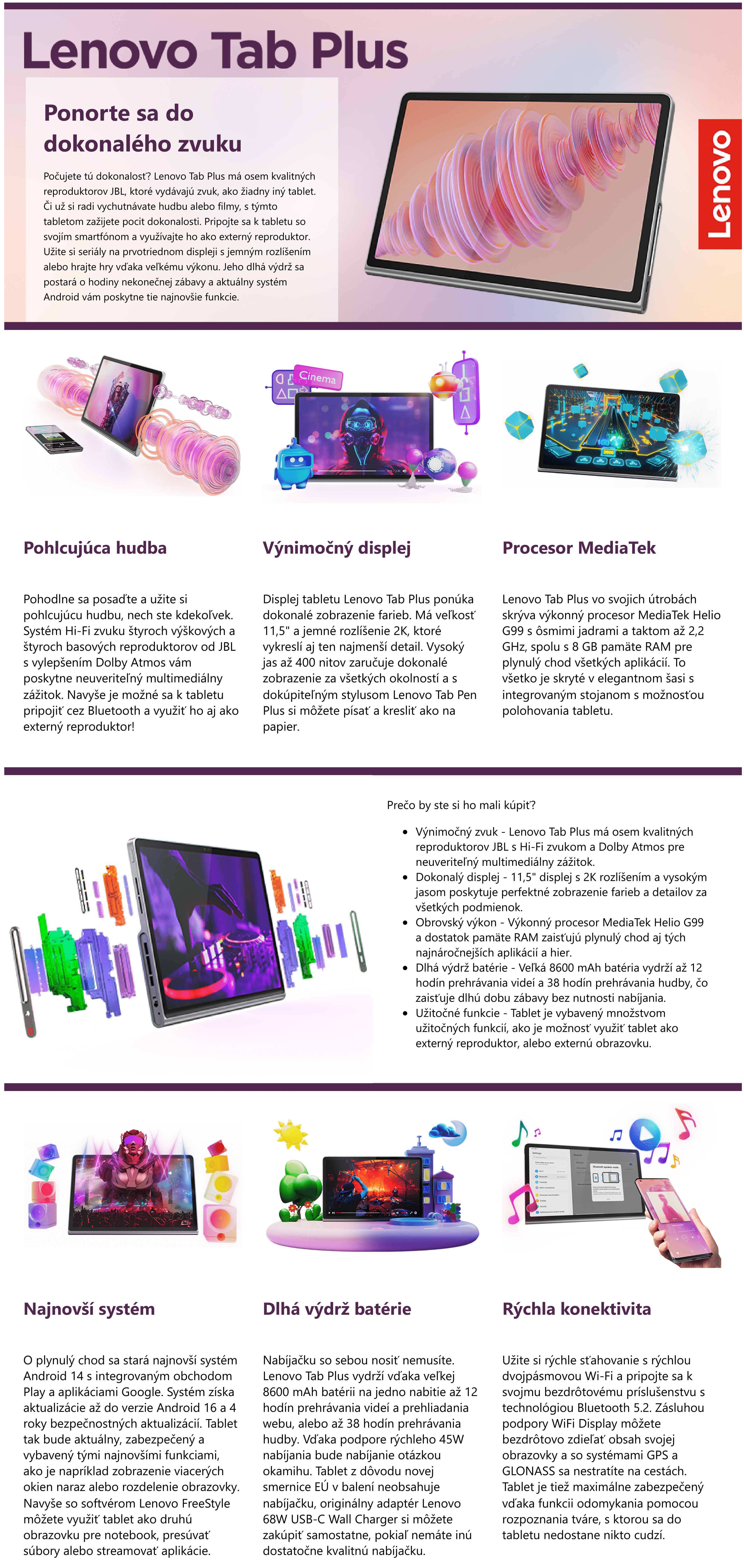 Popis produktu Lenovo Tablet Tab Plus 11.5" 2K 8GB 256GB + SLEEVE