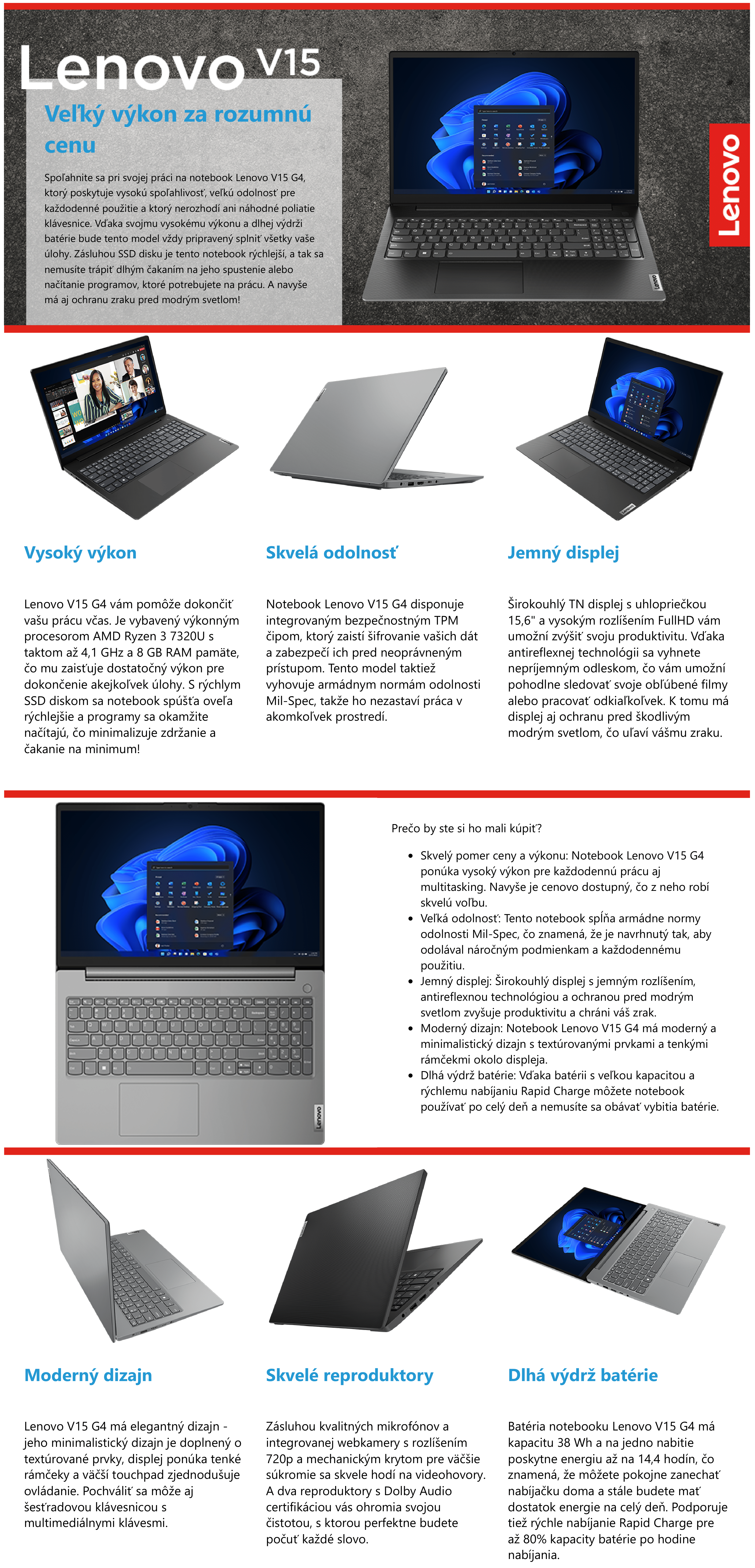 Displej: 15.6" FHD (1920x1080) • Procesor: AMD Ryzen 3 7320U až 4.1 GHz • Grafická karta: AMD • Pamäť RAM: LPDDR5 8 GB • Úložný priestor: SSD: 512 GB • Operačný systém: Windows 11 Home 64-bit • Dotykový: nie