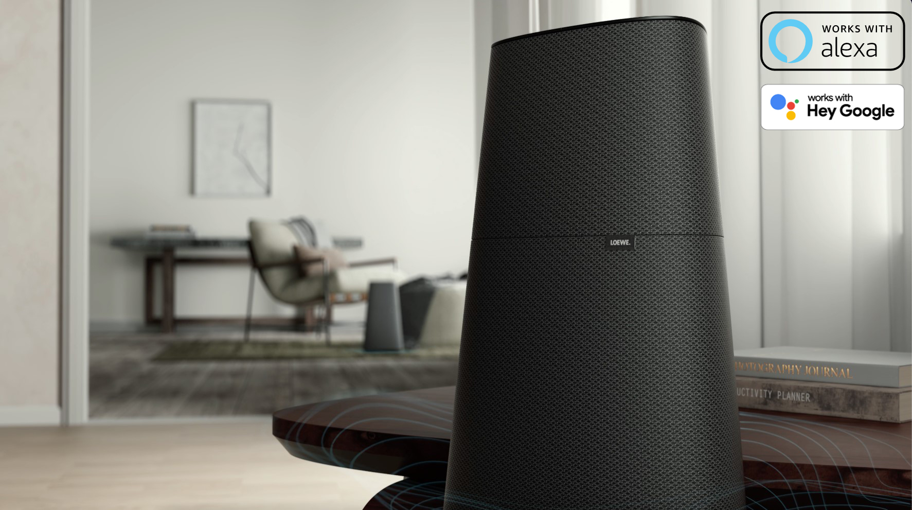 Perfektné pre milovníkov úsporného audio dizajnu: mäkký dizajn v tvare kužeľa, vysokokvalitná akustická tkanina špeciálne vyvinutá spoločnosťou Loewe a elegantný sklenený ovládací panel s LED svetlom sa spájajú pre vytvorenie jedinečného, oceneného dizajnu.