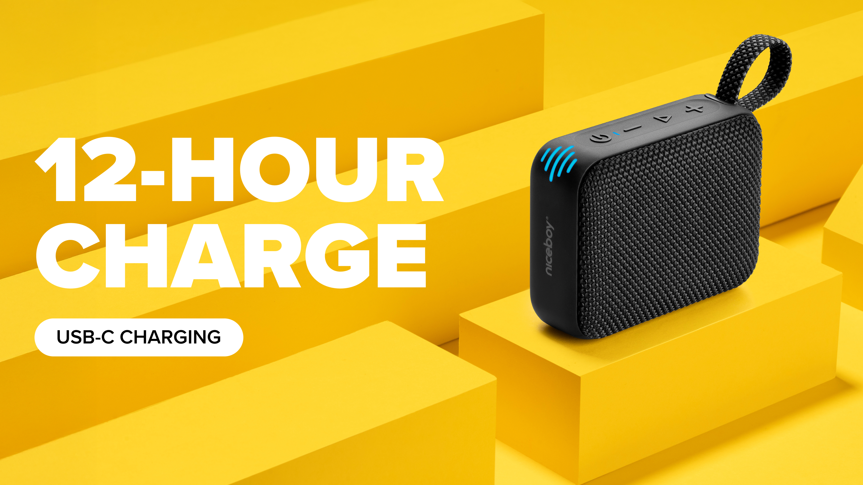 Skúsili ste niekedy spievať celý deň v kuse? Reproduktor Niceboy Atom 4 vydrží hrať až 12 hodín a ani nezachrčí únavou. A keď sa vybije, rýchle nabitie cez priložený USB-C kábel ho opäť postaví na nohy.